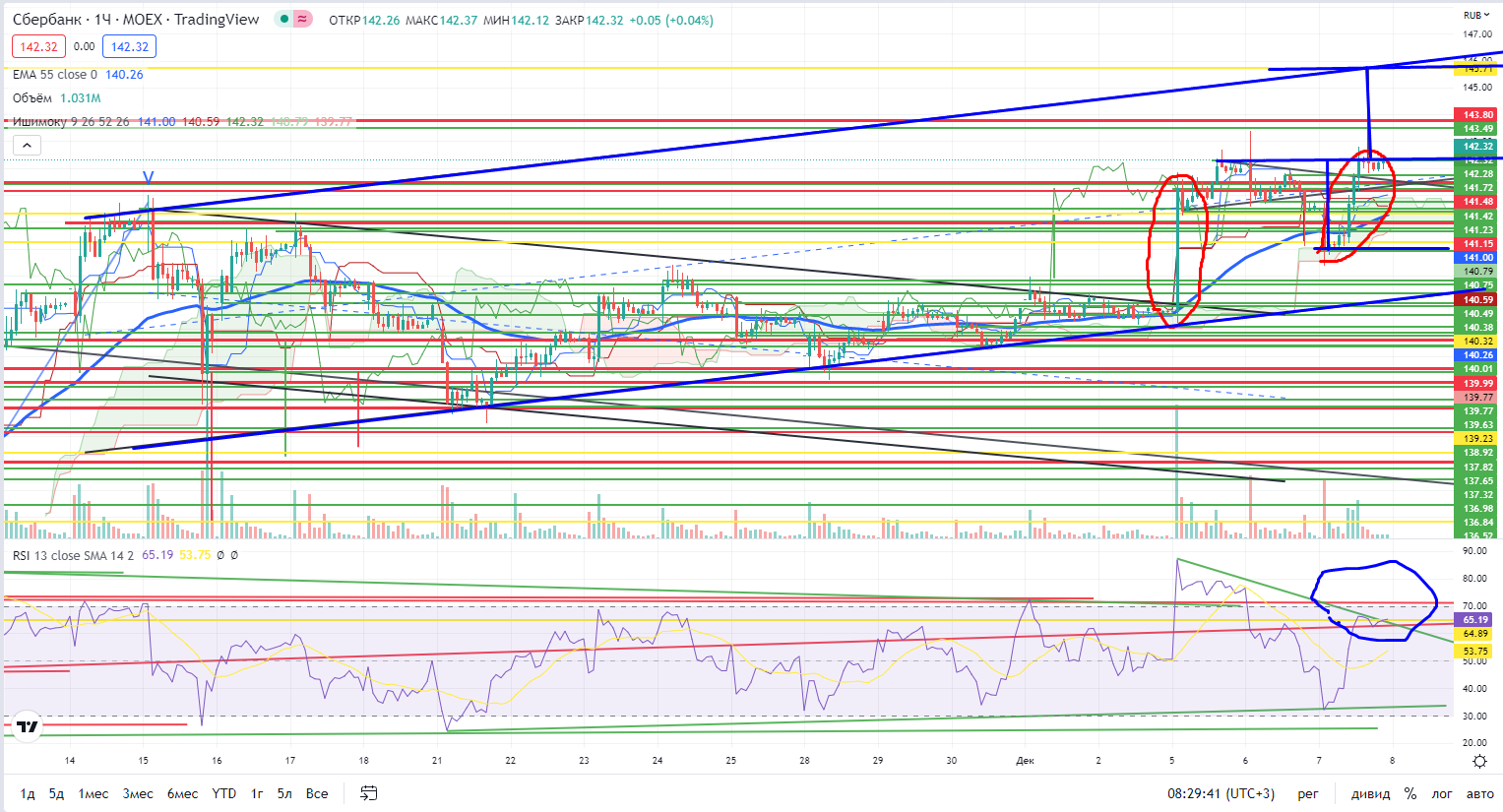 Может у меня глаз замылился, но совершенно идентичные моменты в Сбере наблюдаются, причем на одном ожидание пока "мнимого" отчета... Возможно он и будет, и будет реально хорошим, но покупать я точно здесь не буду! Кстати, в Сбере на часах пока торговля в канале 138,96-142,3, в случае пробоя мишень = 145,64+-, что совпадает примерно с верхней границей растущего канала...При этом потенциальная дивергенция сохраниться, и RSI будет в зоне перекупленности, буду думать, может там и надо снова начинать продавать Сбер...