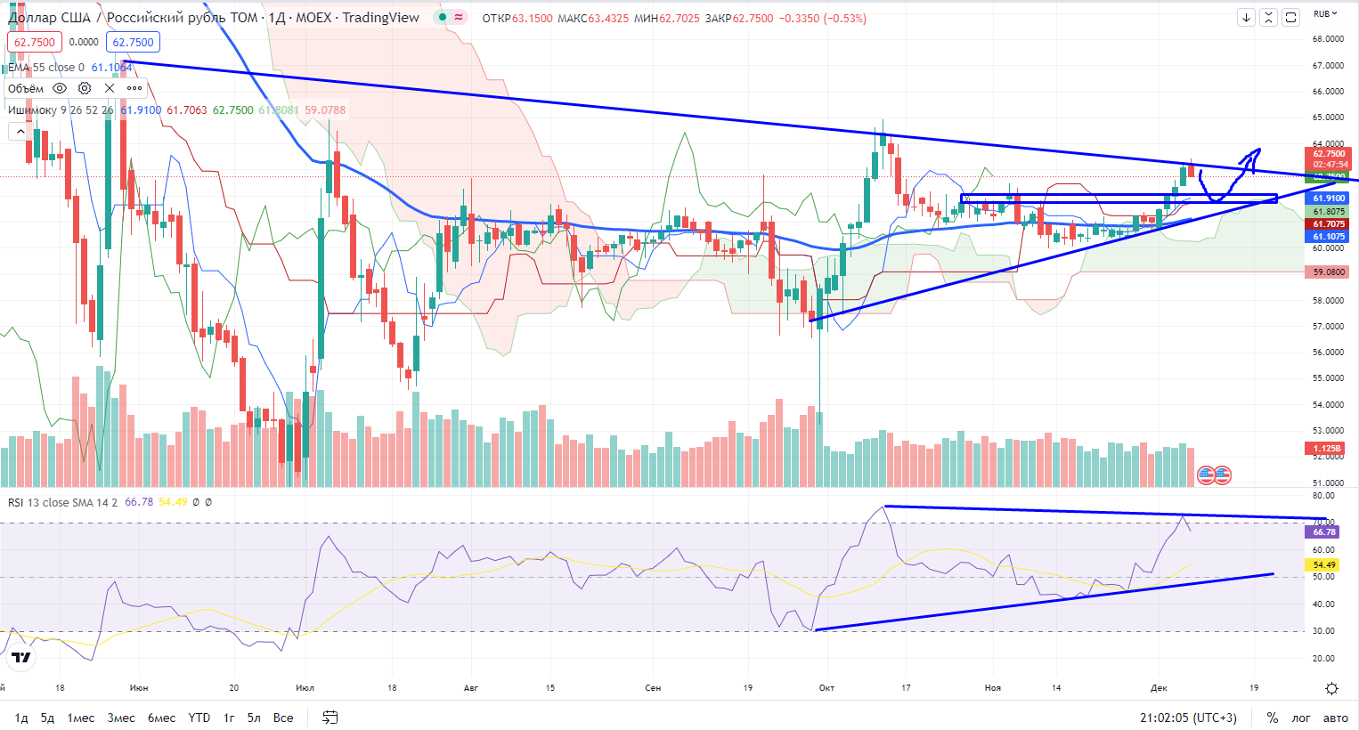 В USDRUB цена пришла под тренд, RSI зашел в зону перекупленности, откат возможен. Но из-за ситуации с потолком нефти коррекцию надо откупать в зоне 61,75-62,1.