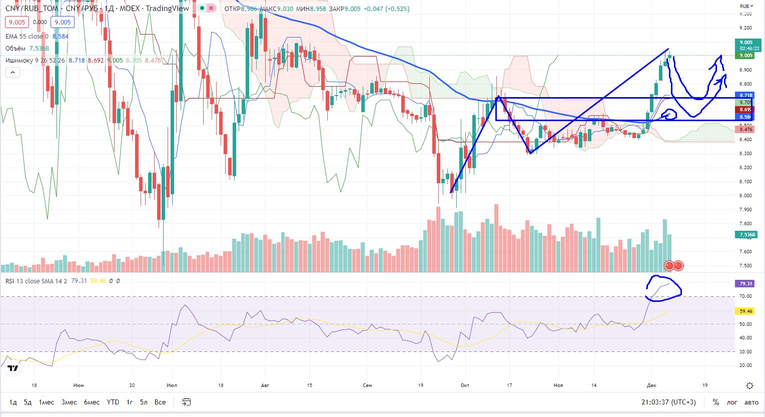 CNYRUB растет безумно сильно, RSI в жуткой перекупленности, покупать тут крайне опасно, но коррекцию надо откупать, рекомендуемая зона очень широкая (8,55-8,7), поэтому на спекулятивном счету можно покупать, но лучше лесенкой покупать на инвестиионном..