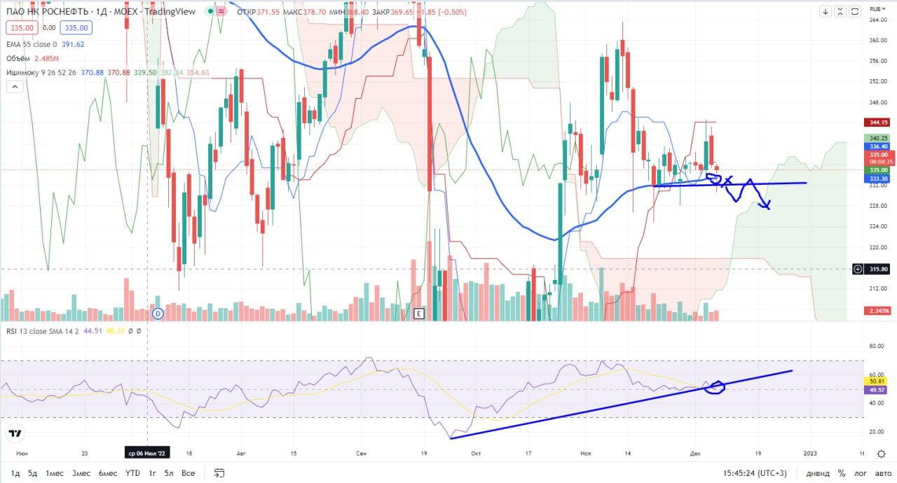 В Роснефти на часах быки потеряли преимущество над медведями (цена ниже 55ЕМА и облака Ишимоку), соответственно можно пока продавать в зоне 334,45-336,9 (+55ЕМА) со стопом 338,6+. Но это локальный шорт, т.к. на часах пробовали дневную поддержку 331,85, над которой надо крыться. А вот при закреплении ниже на днях, лонги надо крыть и на ретесте пытаться шортить в долгую (RSI на днях уже накернивает дивергентный тренд)!!! Писал об этом ранее — «Судя по всему идея на эту неделю - Роснефть, при проходе и закреплении не днях ниже 331,8- (совпадает с 55EMA) = тоже шорт. Конечно пока локальный, есть зона поддержки 313,45-316, но это порядка 5% от точки пробоя.»