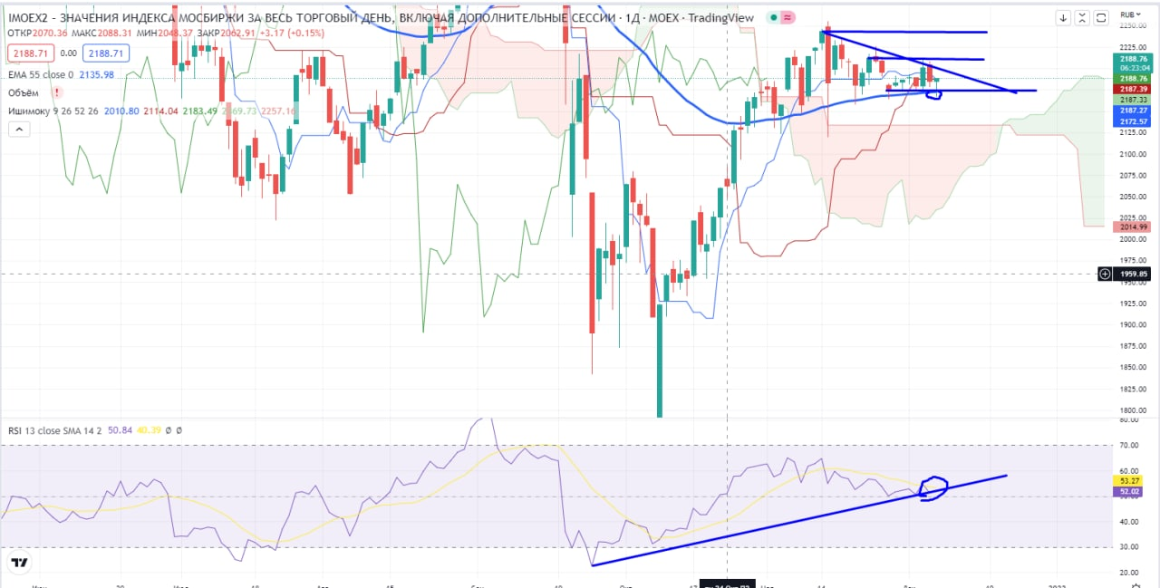 При этом на днях Индекс ММВБ снова на 55ЕМА и возможен выход вниз из треугольника вниз с поддержкой все тот же 2174, мишень от пробоя = 2105+-, RSI уже пробивает свой дивергентный тренд…