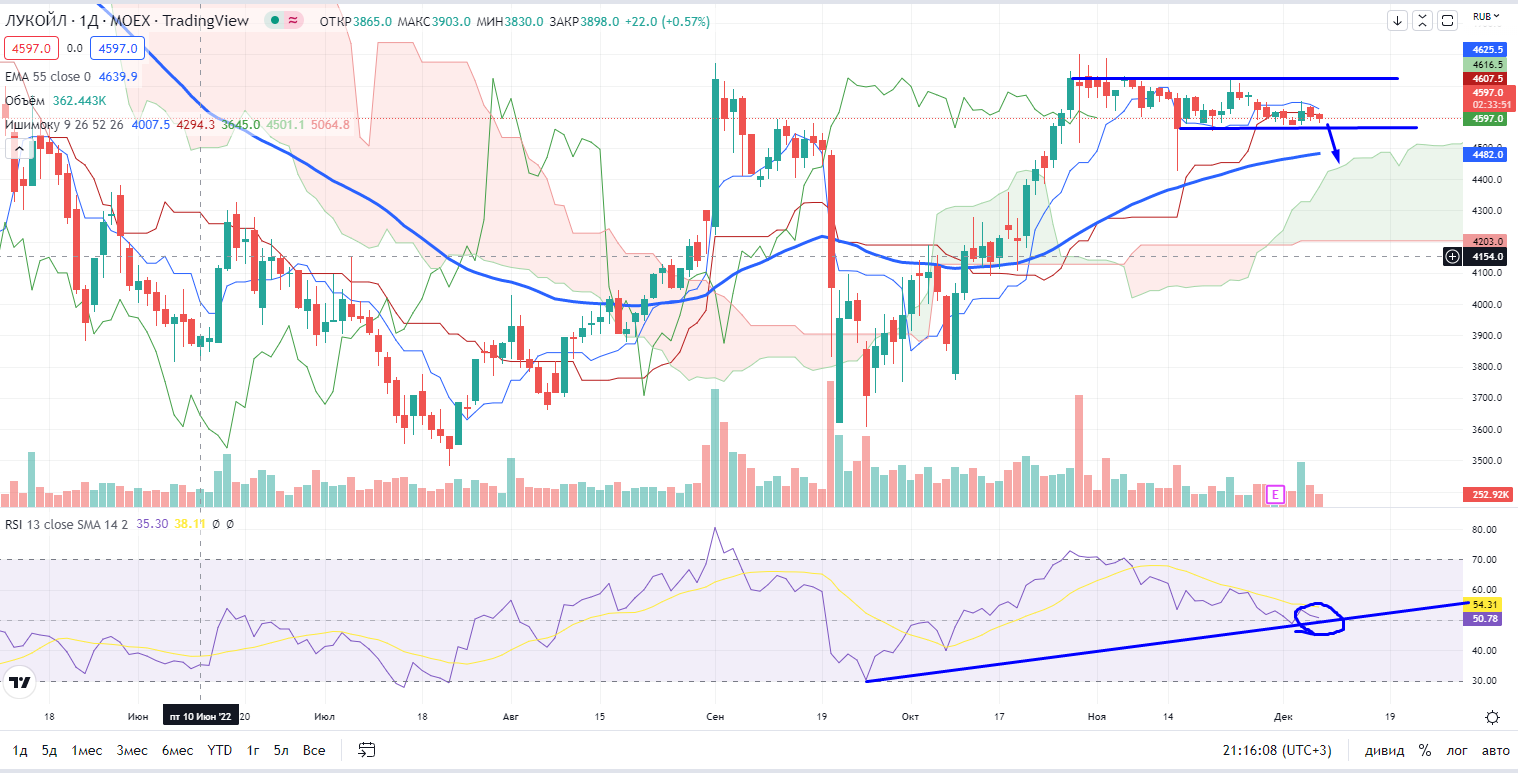 Лукойл близок к пробою вниз — «И Лукойл в случае закрытия на днях ниже 4565- пробьет канал 4565-4679, мишень от пробоя =4451±, что примерно совпадает с 55EMA (тоже порядка 2%)»…