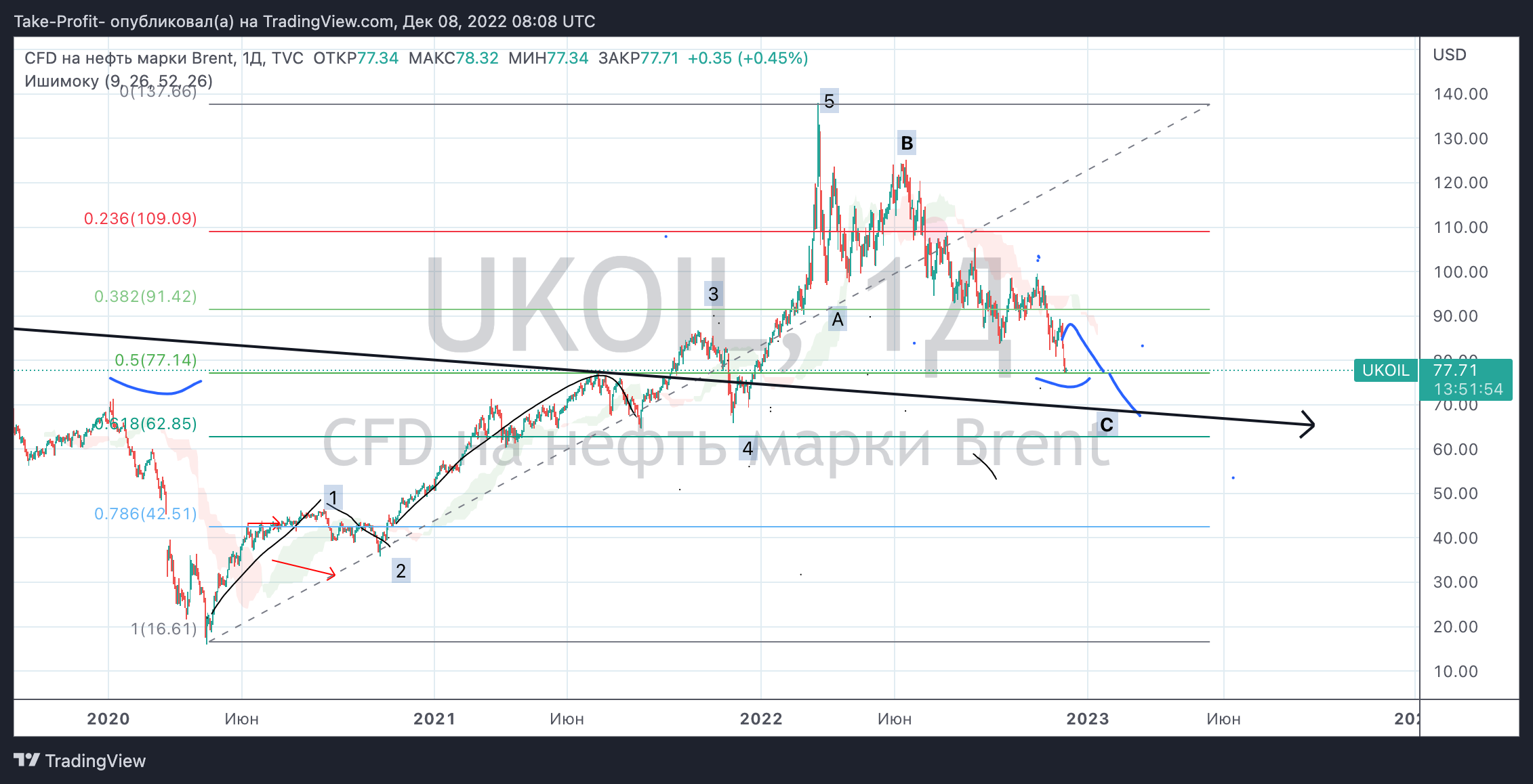 Вчера случилось знаковое события, нефть марки Brent пришла на уровень 77 долларов - это 50% по фибоначчи от своего тренда с низов 2020 года, здесь должна быть как минимум консолидация. Можно даже открывать спекулятивные лонги в расчете на отскок.