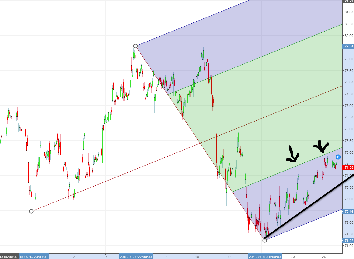 Ещё красивее этот рост выглядит на младших тайм фреймах. По вилам Эндрюса блтжайшая цель сверху находится на уровне 75,3. Цель внизу - 72,5. Пока характер движения указывает что больше шансов отработать цель снизу, дорогу для этого откроет пробой классического тренда (на картинке чёрная линия) :