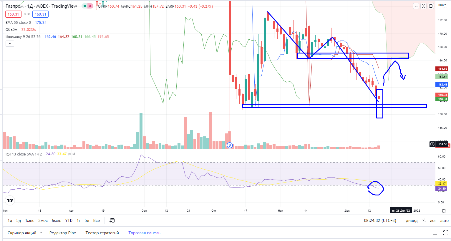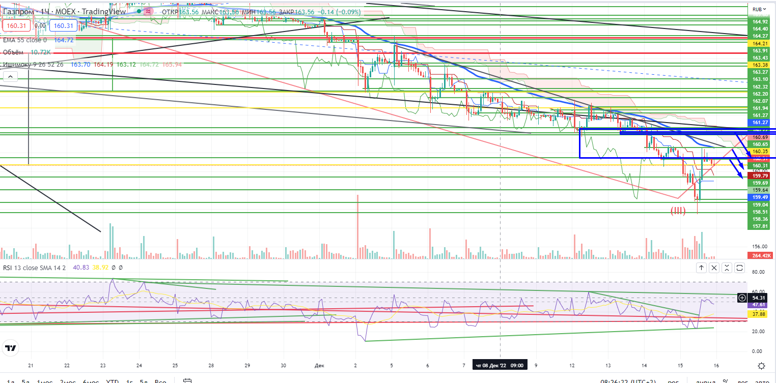 В Газпроме на данный момент(!) на часах зона продажи 160,65-163,29 (там все), стоп 164,1+. Но с течением времени зона может уменьшаться (облако Ишимоку "давит"), и возможно уже сегодня стоп будет при пробое 162,24 (т.е. 163,1+). Это надо учитывать с точки зрения объемов!