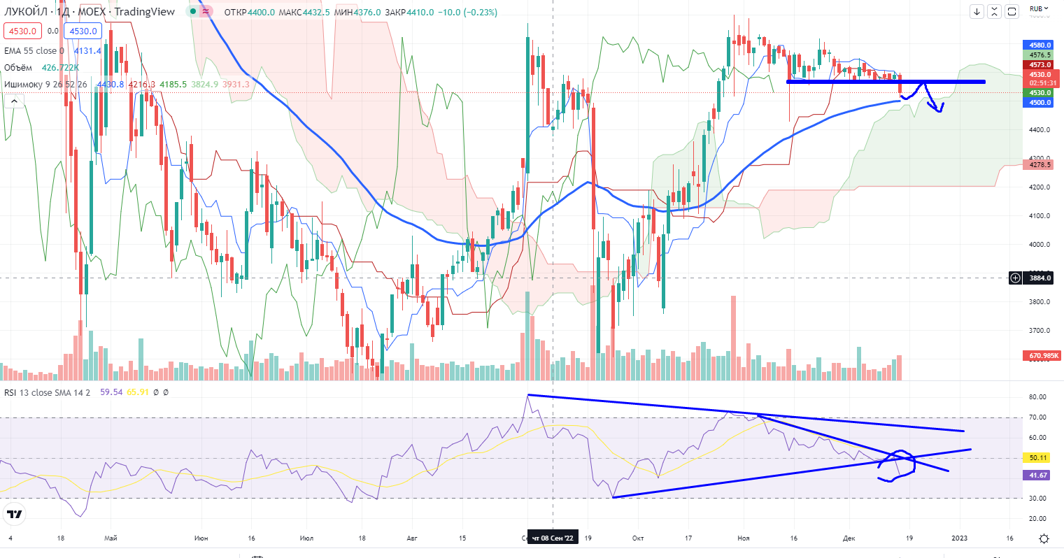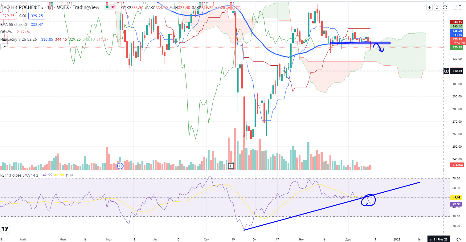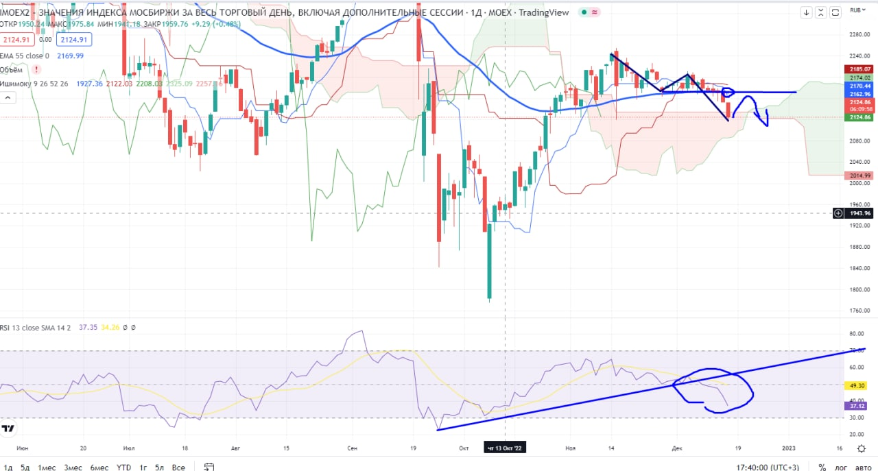 За час до окончания основной сессии Индекс ММВБ на днях торгуется плотно ниже 55EMA и заходит в облако Ишимоку. Приоритет у медведей. Влияние квартальной экспирации я считаю незначительным, отскок надо использовать для закрытия лонгов и входа в шорт!!! Возможно зарождение падающего тренда (3-я волна).