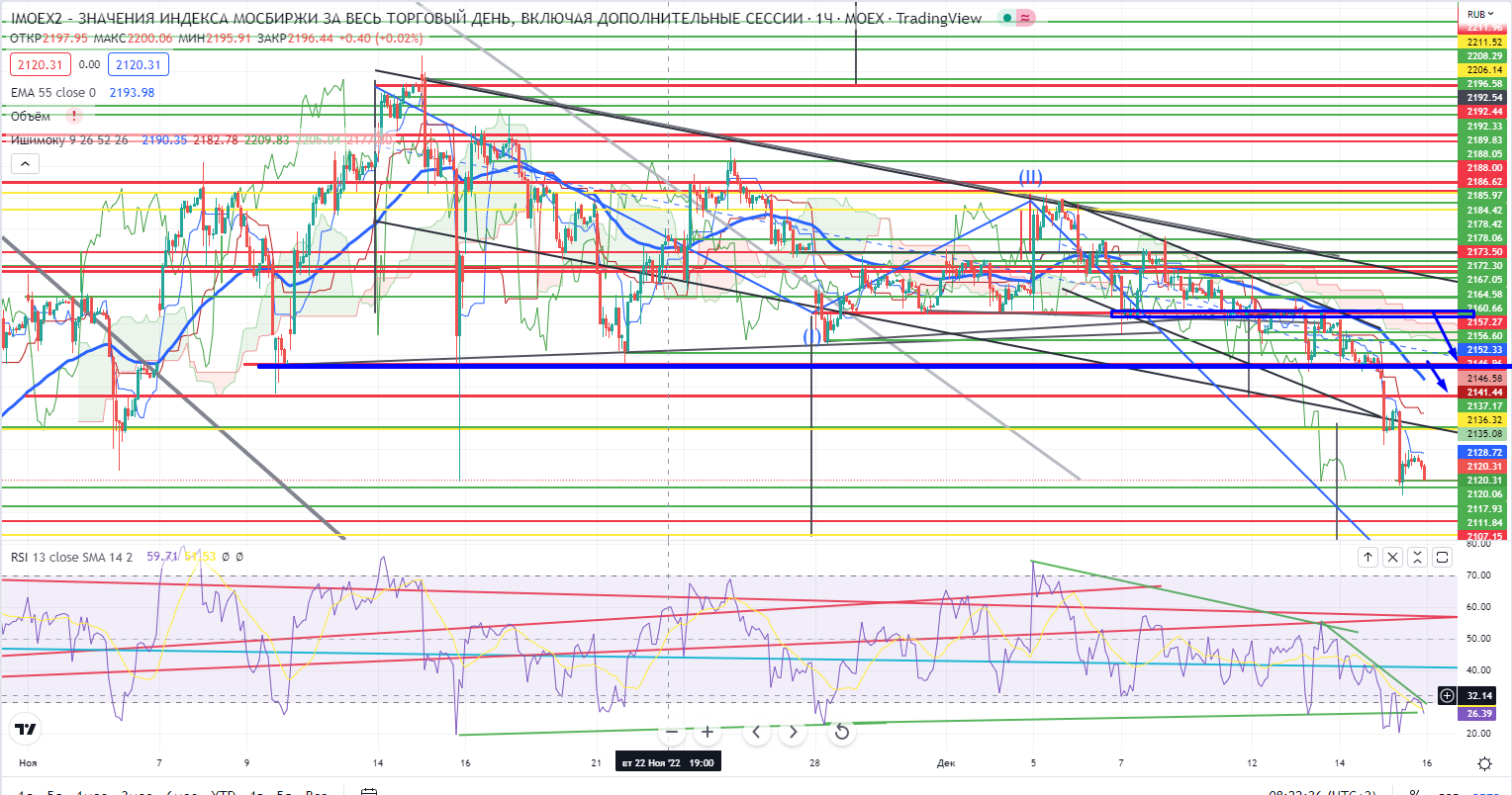 Падение было очень сильным (по крайним меркам), отскок вверх тоже может быть сильным, но цена в Индексе ММВБ на часах ниже 55EMA, поэтому в широкой зоне 2156 (+55EMA) на зону - 2172-2174 (старая зона поддержки + облако) нужно искать точки выхода из лонгов и точки входа в шорт.