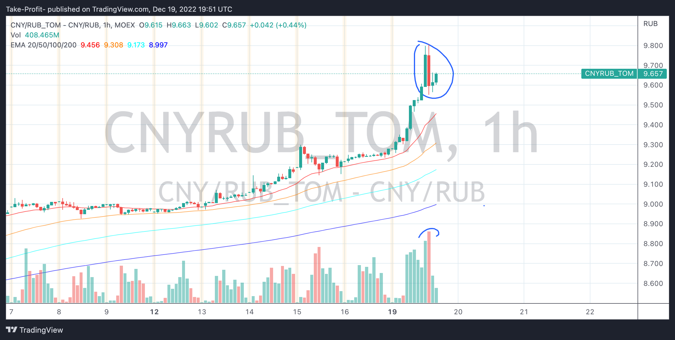 Юань дошел до наших целей и нарисовал разворот, что видно на графике. Мы закрыли пока сделку. Ждем как минимум хорошего отката для закупа и потом до 10 как минимум.
