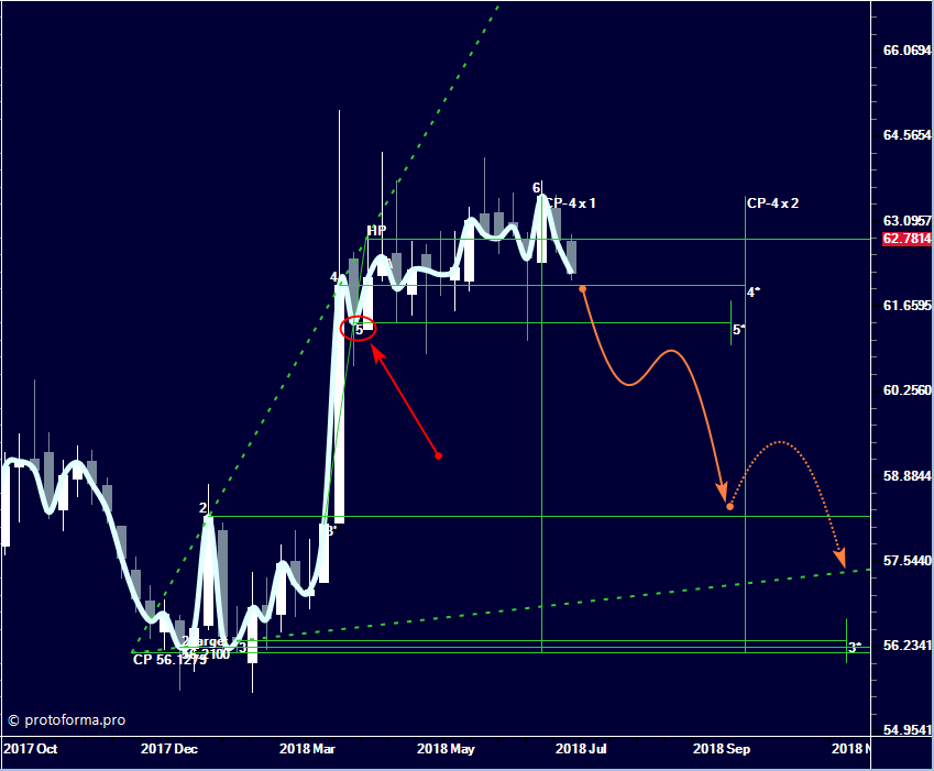 В случае пробоя уровня точки 5 МР (модели расширения) на неделях цена «устремится» к ЛТ (линии тренда):