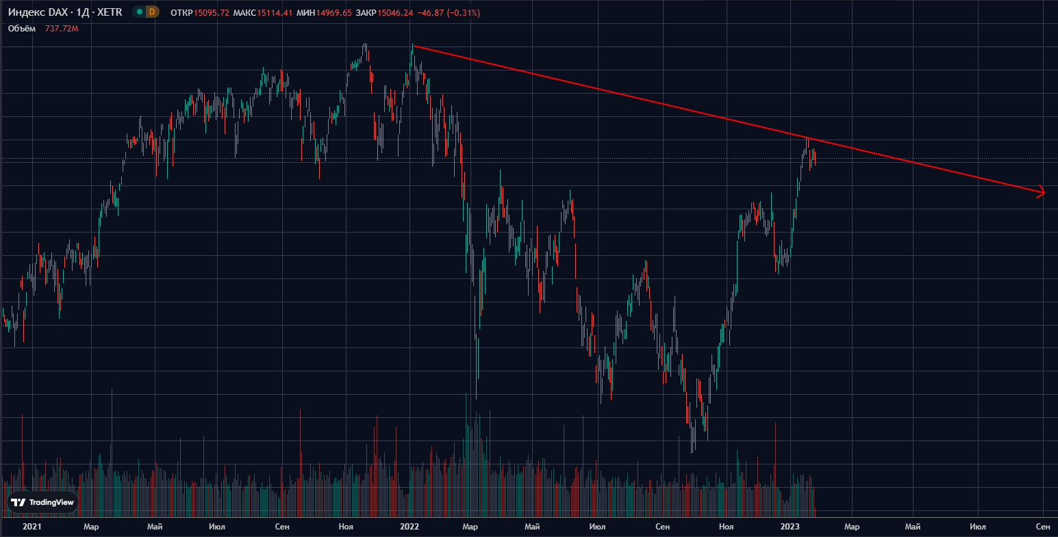 Индекс DAX с сентября 2022 года показывает хороший рост, но последние сессии он пытается развернуться в своем медвежьем тренде. На это указывает его перекупленность и попытка разворота. В случае продолжения его падения, порядка 30% это может поддержать индекс доллара и развернуть драг металлы.
