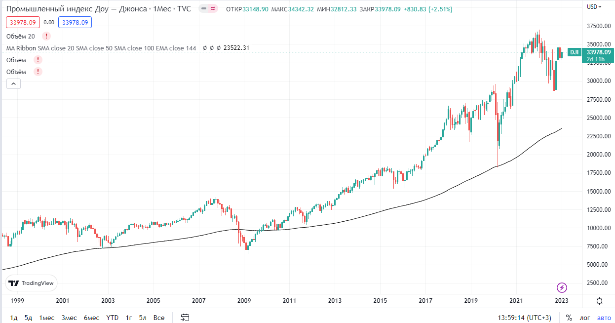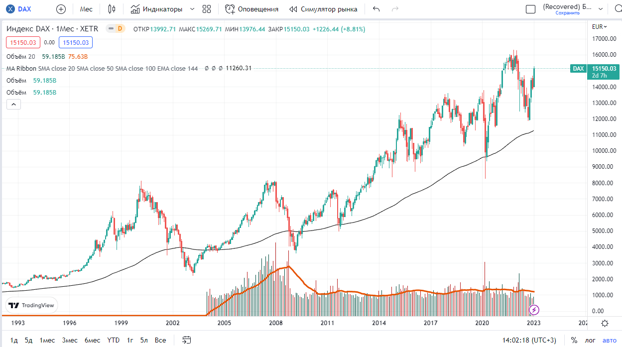 В качестве примера возьмем три индекса: 2 европейских DAX и STOXX 600, американский промышленный индекс Доу Джонс. Ниже графики этих индексов, интервал свечей месяц: