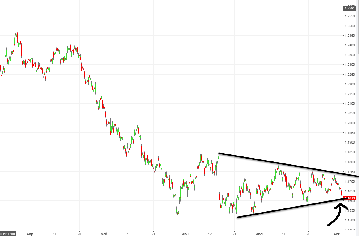Сначала посмотрим на сам график пары евродоллар. Евро подошло к нижней границе консолидации: