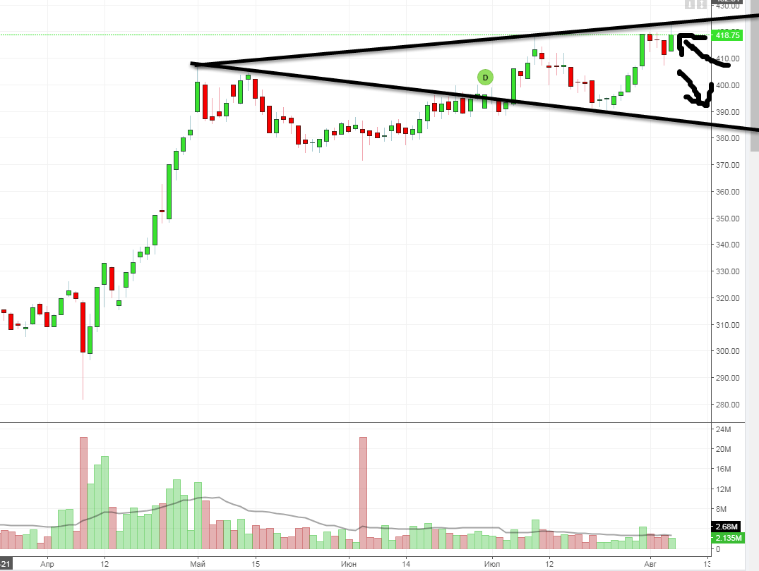 Новости говорят о байбеках, хорошей отчётности и прочих хороших фишках для быков. В тоже время именно на этих новостях сформировалась техническая картинка с точкой для шорта.