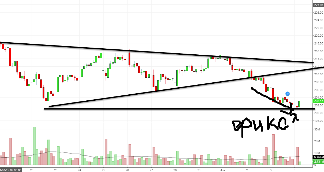 Тогда я предлагал торговать выход из этой консолидации, предполагая выход вниз. Именно вниз из консолидации сбербанк и вышел. Моей целью тогда был уровень 190. Но сейчас я скланяюсь к закрытию шорта у ближайших поддержек в районе 200, учитывая что сбербанк проявляет у поддержки силу сейчас. Предлагаю фиксировать профит в этом случае.
