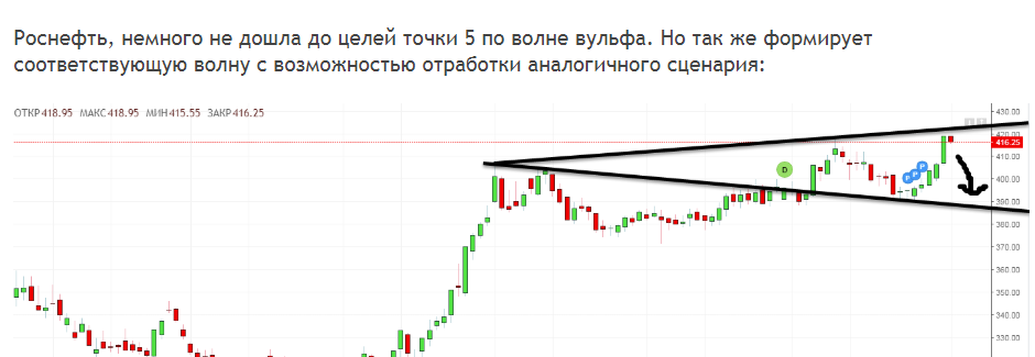 В посте от 1 августа я приводил картингку с волнами вульфа в Роснефти и Лукойле. Ситуация была интересна тем что если в Лукойле волна уже была сформирована, то в роснефти она немного не дошла до целей входа. Скрин из того поста: