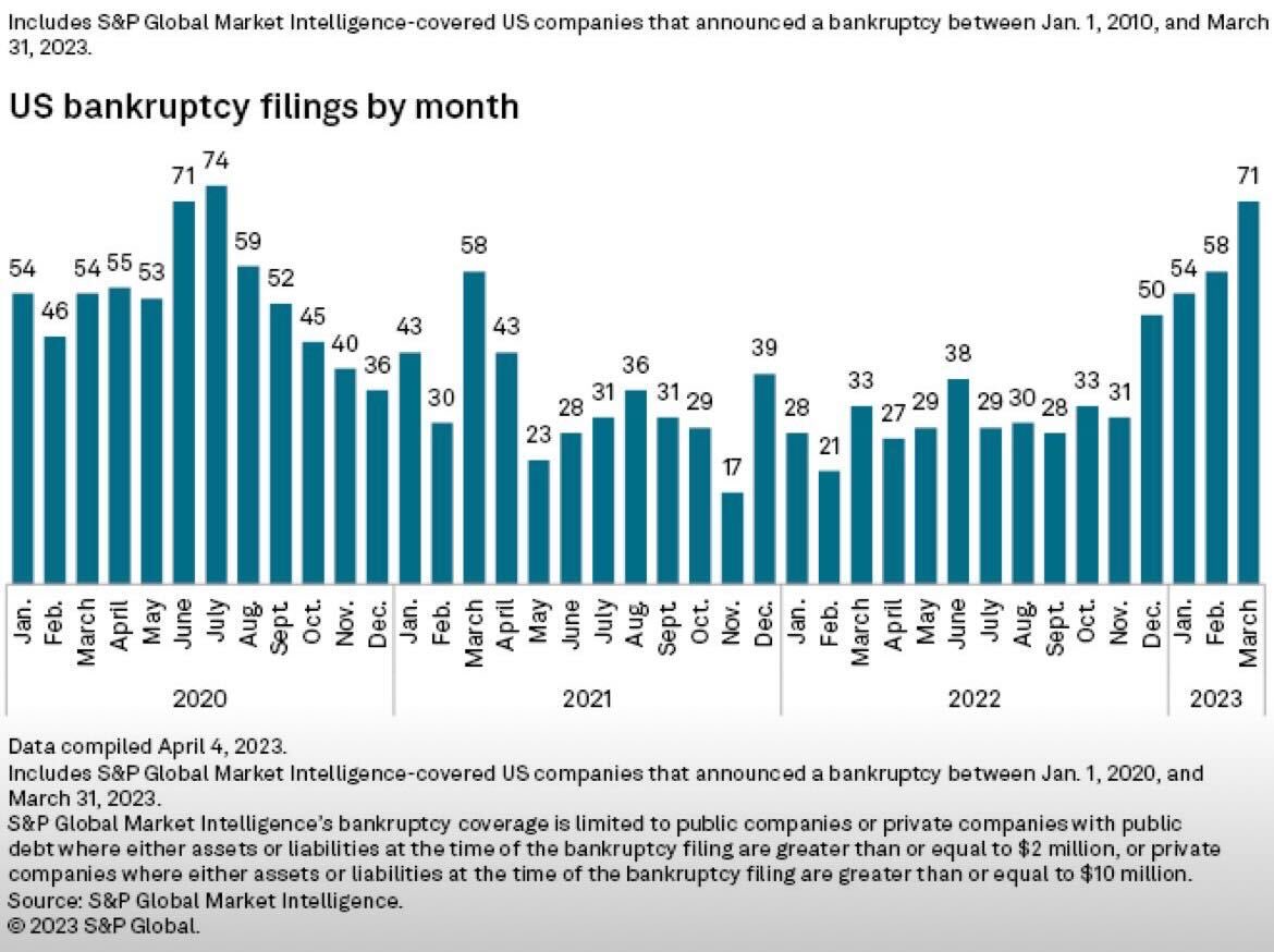 Аналитическая компания S&P Global Market опубликовала данные, согласно которым в марте 2023 года 71 компания в США подала на банкротство. Это рекордные значения с 2020 года.