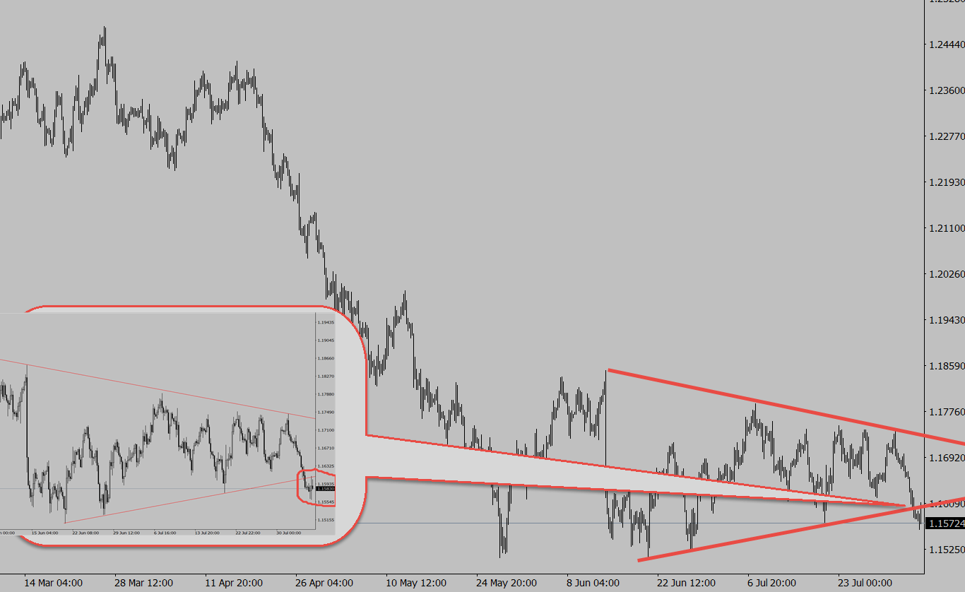 сужающийся треугольник — уменьшение волатильности — попытка пойти вверх;