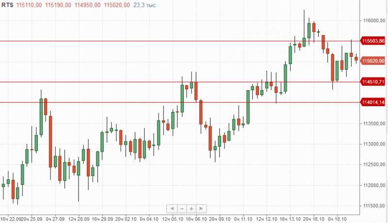 фРТС на прошедших торгах так и не смог пройти локальное сопротивление 115500п., преграждающее дорогу к предыдущему максимуму 116000-116200п. И в текущей ситуации поддержка расположена на отметке 114000п.