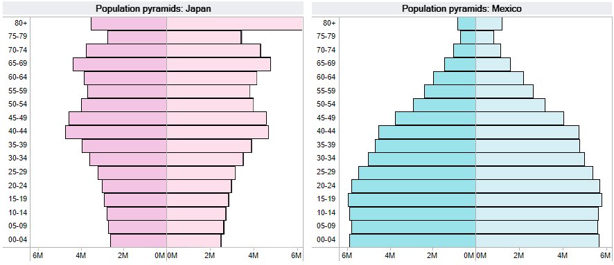 На первый взгляд Япония и Мексика имеют схожее количество населения (127 и 129 млн. человек соответственно). Но при внимательном рассмотрении разница в население стран поразительная.