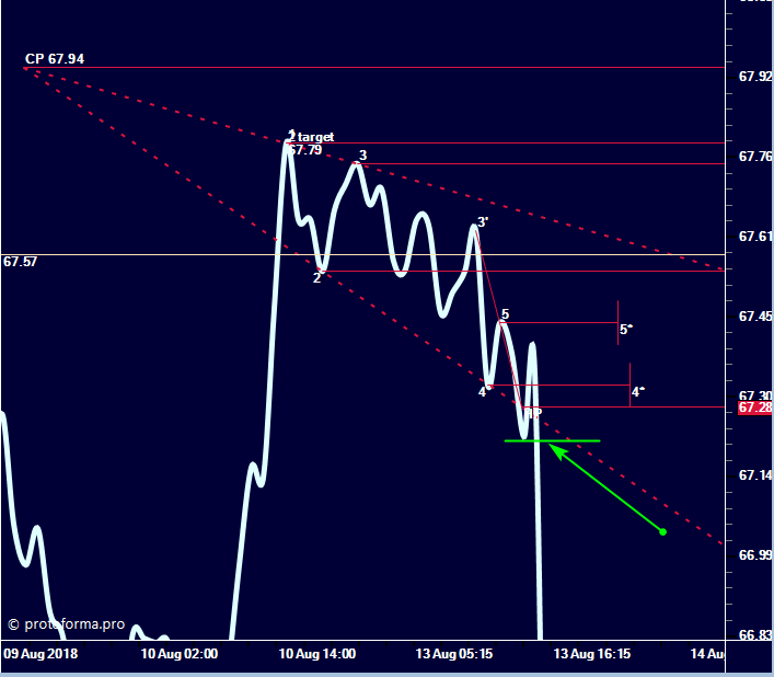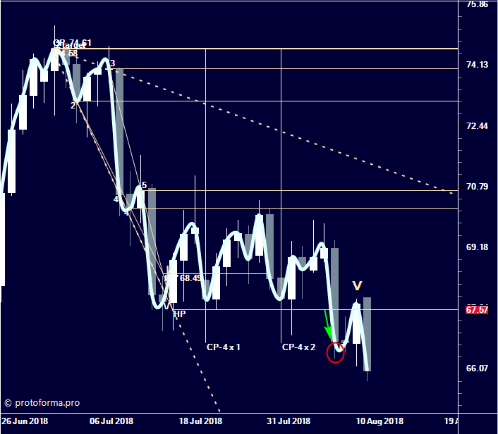 В предыдущем топике Нефть. Входить по тренду всегда спокойней ( CL, Brent ) была показана МР (модель расширения ) на дневном плане и вариант торговли в вариативной ситуации на ап отскок от уровня НР 67.57. Когда этот уровень пробили ( цена «смачно» закрылась под уровнем зелёная стрелочка ) уровень НР выступает, как сопротивление (След):