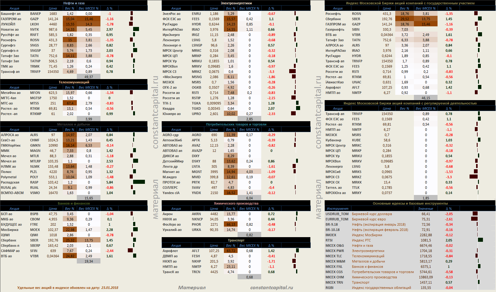 Динамика акций за текущий день, в структуре отраслевых индексов, и индексов государственного сектора.