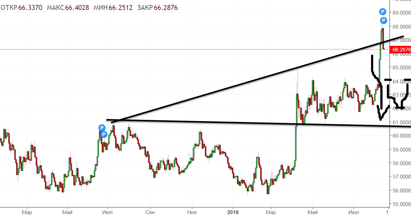 В рубле сформировалась волна Вльфа с точкой входа в районе 67 рублей за доллар. Рубль ненадолго заходил в свит зону, но быстро вернулся оттуда. Классическая цель 61. Но волна не самая красивая, предположительные цели в ней район 62-64 рубля за доллар.