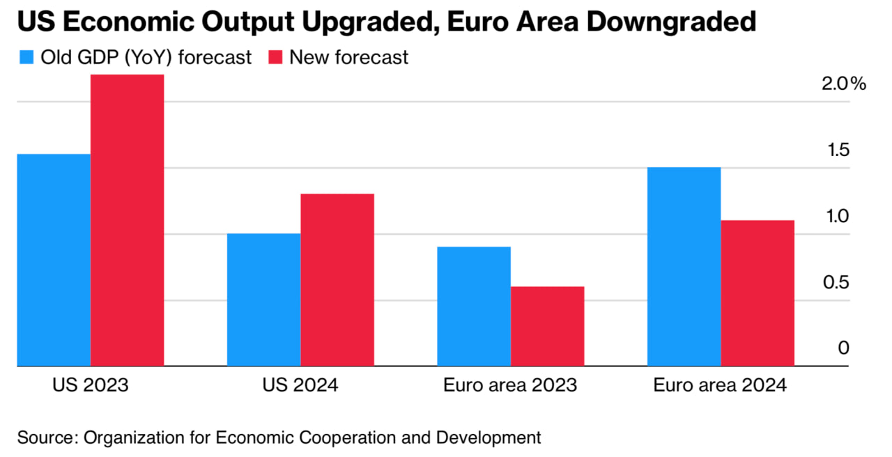 США, помимо того, что крупнейший потребитель нефти, еще и крупнейший её производитель. А вот у Европы такого преимущества нет. При этом Европа импортирует очень много черного золота. Поэтому в обновленных прогнозах ОЭСР прогнозы роста экономики США были пересмотрены в сторону повышения, а еврозоны — в сторону понижения.