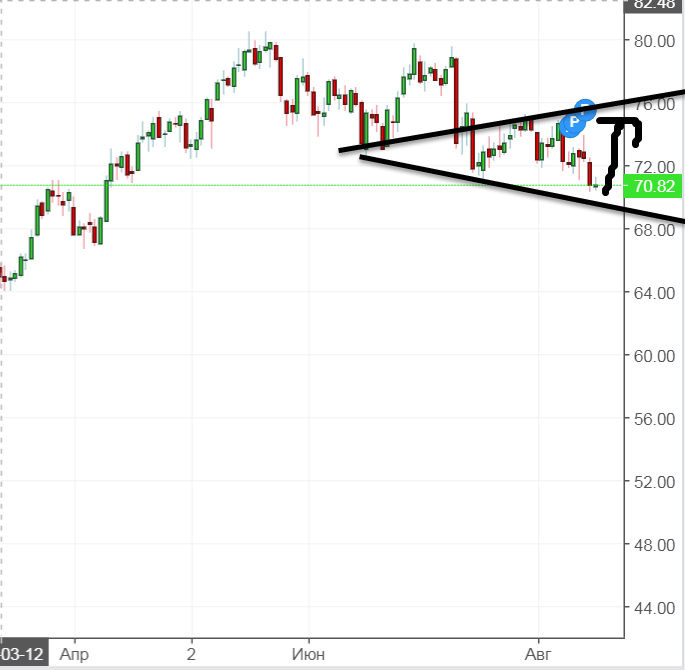 Волна не самая красивая. По классической технике нефть выглядит слабо. Кроме того, до цели входа внизу нефть немного не дошла вчера, что намекает на вероятность перелоя. Но, всё таки.