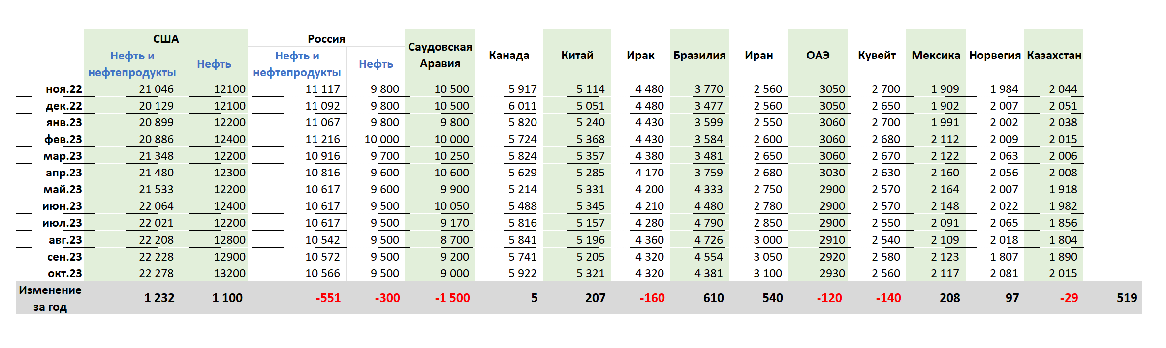 За год предложение нефти от ТОП-13 стран мира, которые добывают более 2 млн баррелей в сутки, увеличилось в общей сложности на 500 тыс. баррелей в сутки. Больше всех нарастили добычу США (+1,1 млн), потом идет Бразилия (+610 тыс.), Иран (+540 тыс.), Мексика и Китай (+200 тыс.). Больше всех сократили добычу Саудовская Аравия (-1,5 млн), Россия (-300 тыс.), Ирак (-160 тыс.), Кувейт (-120 тыс.), ОАЭ (-120 тыс.).