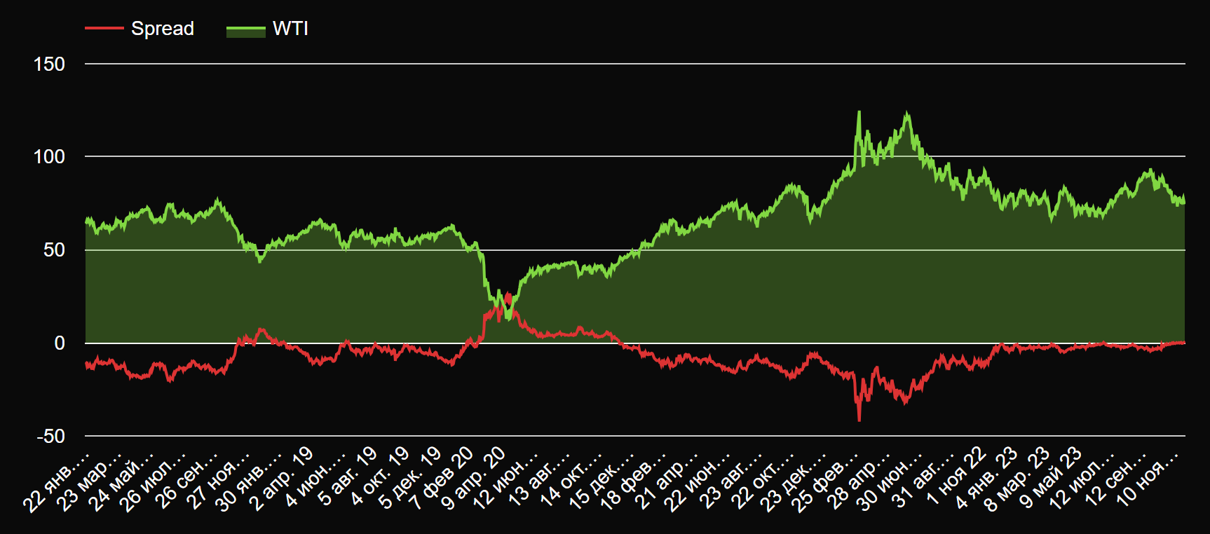 Спреды между контрактами на рынке нефти болтаются вблизи нулевых отметок уже около года. Боковая динамика на рынках бывает часто, она бывает на разных уровнях, но выход из "боковика" как раз-таки происходит в периоды сильных движений на рынке. Поэтому стоит понаблюдать за спредами.
