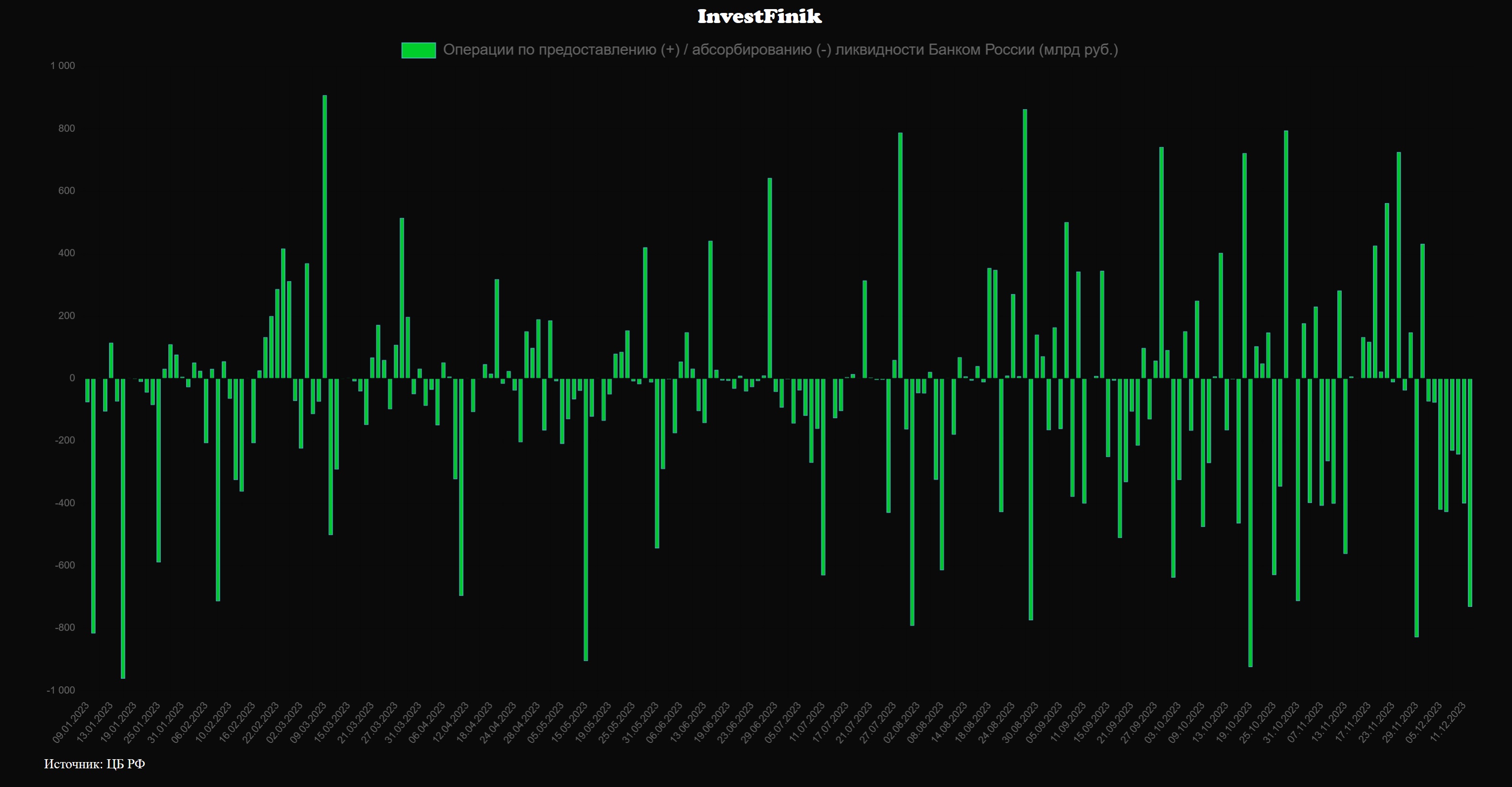 Банк России в последние две недели активно забирает ликвидность с рынка. С конца ноября был лишь один день, когда центральный банк предоставлял ликвидность. В остальные 9 рабочих дней он забирал средства с рынка.