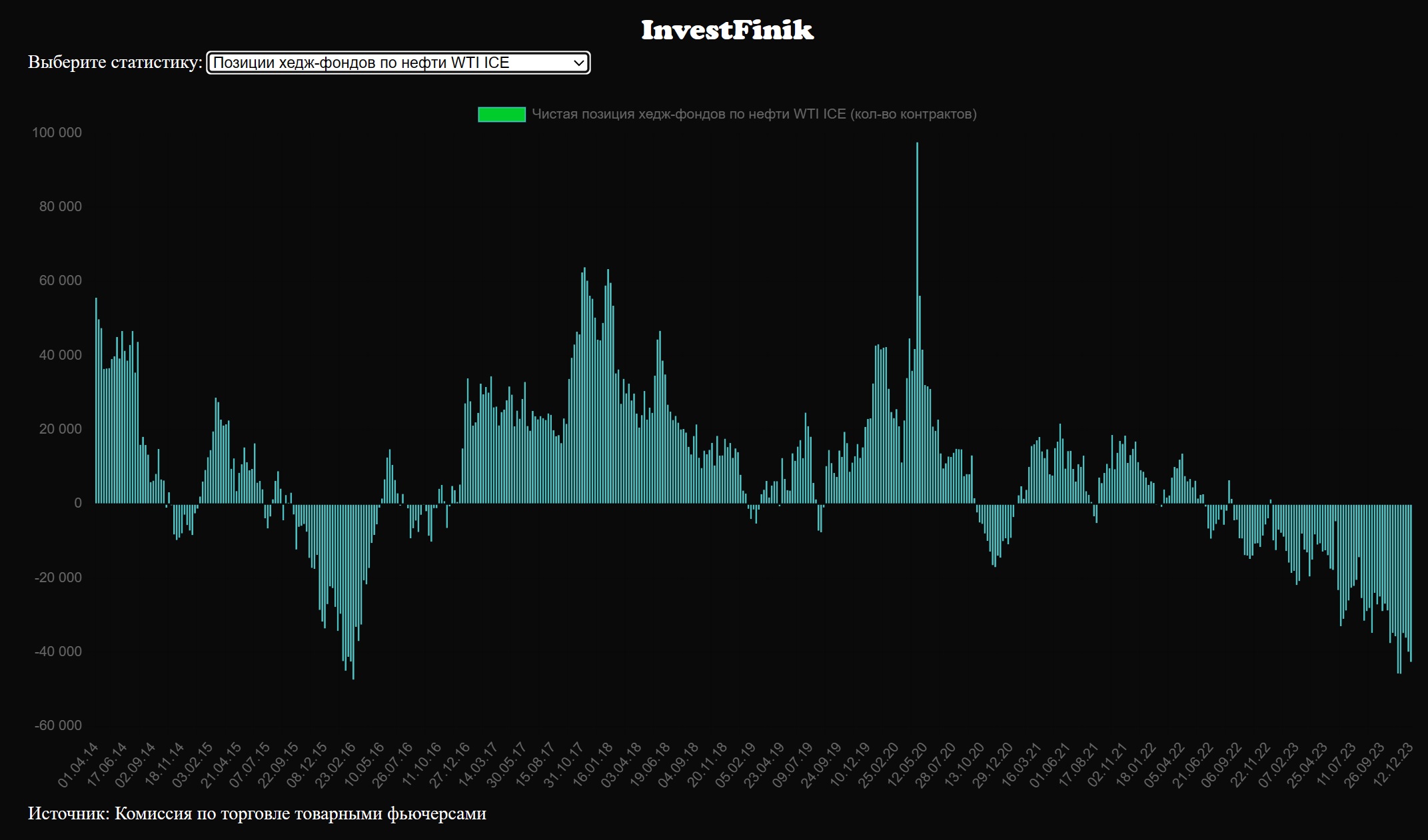 Игра на понижение по нефти продолжается. На прошлой неделе спекулянты увеличили свои короткие позиции по нефти WTI на бирже ICE. По состоянию на 12 декабря их чистый "шорт" достиг 42,6 тыс. контрактов, очень близко к локальным максимумам.