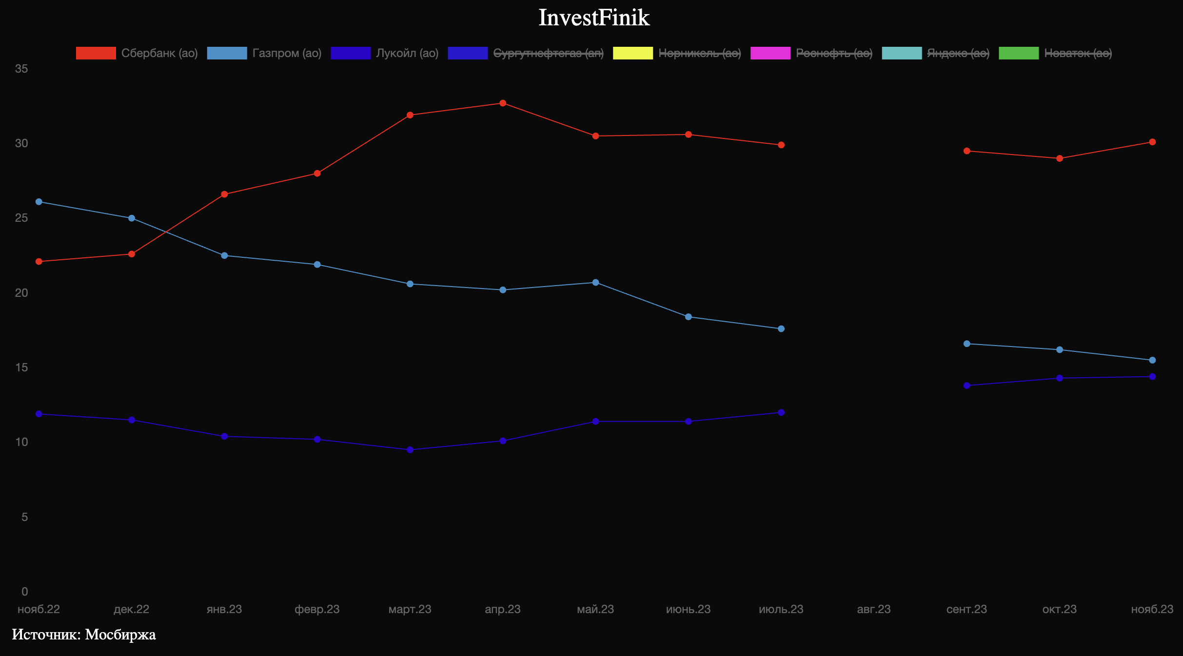 Получается, за год популярность Газпрома растеряла 10,6 процентных пункта. Сейчас его место заняли акции Сбербанка с долей в 30,1%. Также, еще немного и Лукойл может потеснить Газпром со второго места.