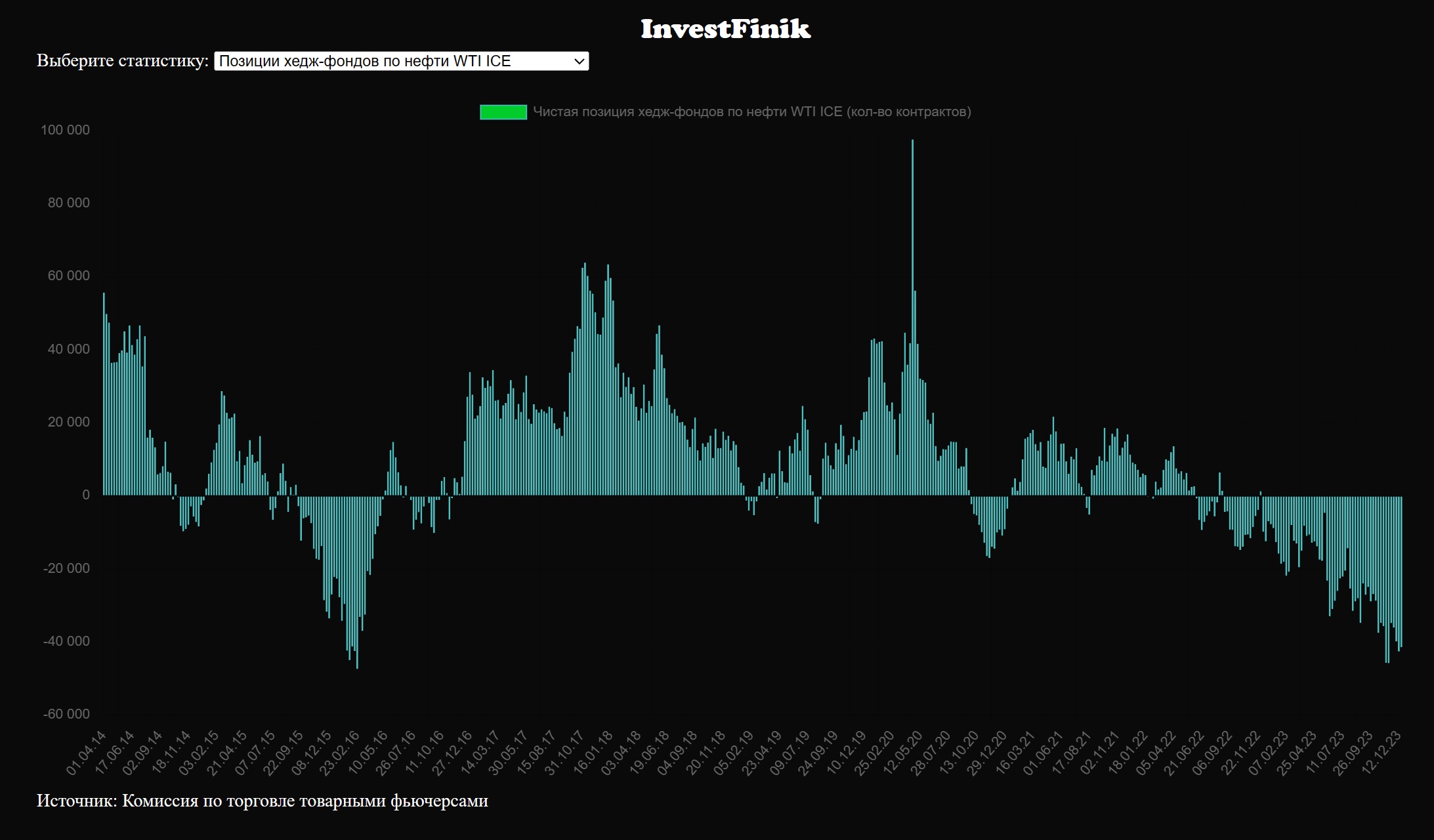 По состоянию на 19 декабря объем чистого "шорта" среди спекулянтов на бирже ICE по нефти марки WTI составил 41,4 тыс. контрактов.