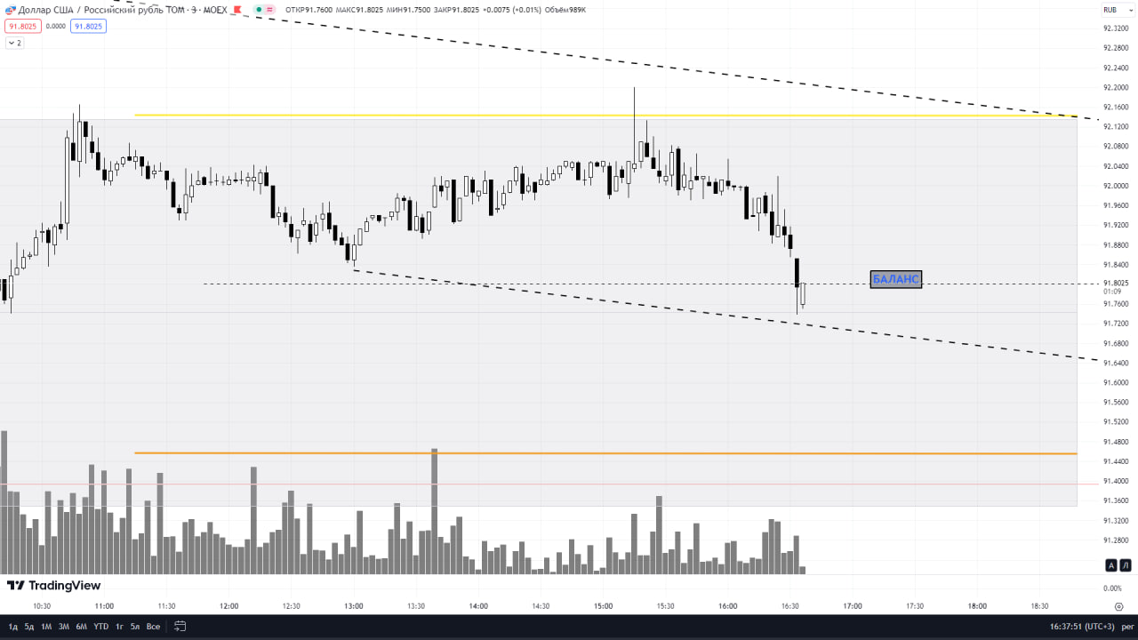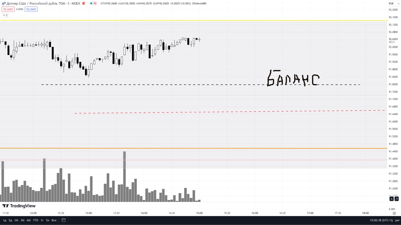 Итак вот пример моей сделки которые я делаю почти каждый день. Желтая и коричневая линии это коридор за который не должна выходить цена, баланс это по сути сильнейший уровень и он же цель. Прогноз дан в районе 15.00 по МСК.
