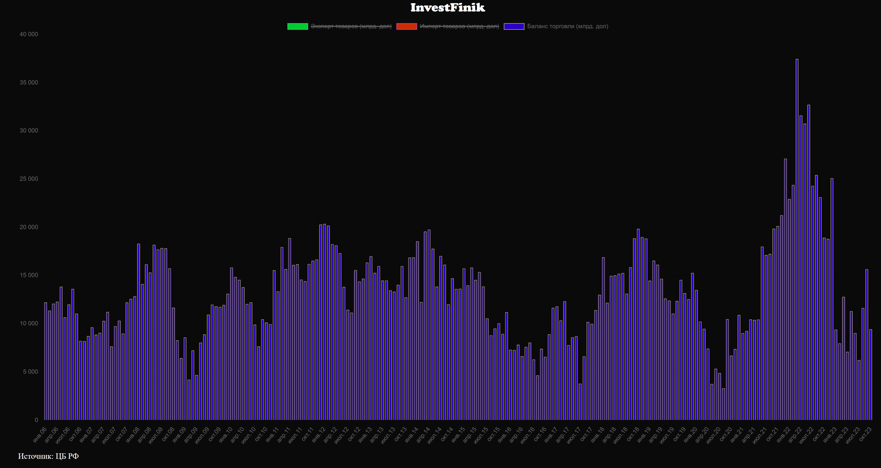 Российская экономика является экспортно-ориентированной и за последние тридцать лет лишь в феврале 1998 г. был зафиксирован дефицит торгового баланса товарами. Все остальное время внешняя торговля была профицитной и прошлый год не исключение. В 2023 г. профицит экспорта над импортом составил примерно 120 млрд долларов, однако даже такой приток средств не смог предотвратить обвальное падение рубля, которое наблюдалось на протяжении первых десяти месяцев.