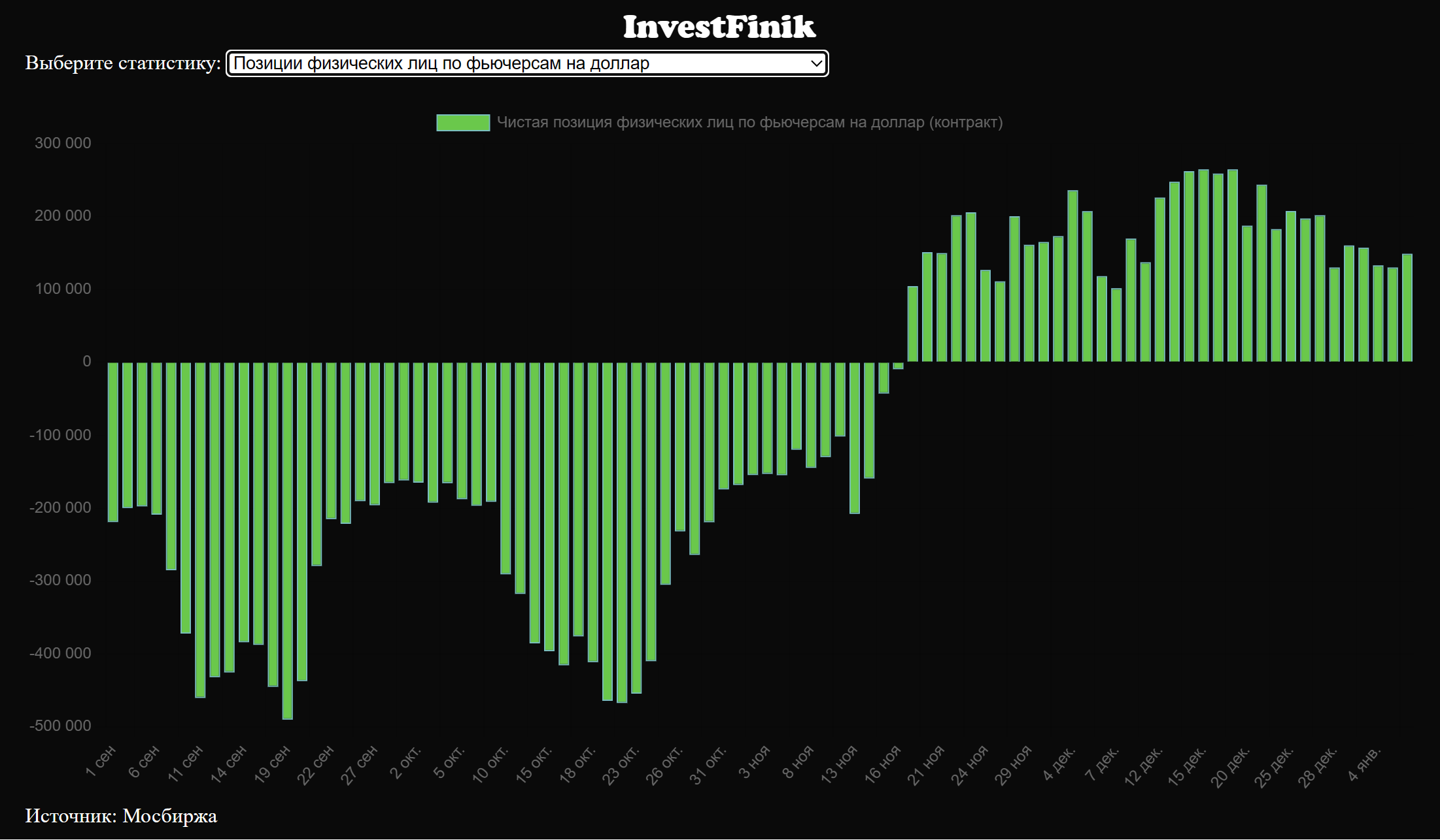 Частные спекулянты начали год с игры против рубля. По итогам вчерашней сессии объем длинной позиции по фьючерсам на американский доллар составил 148,8 тыс. контрактов.