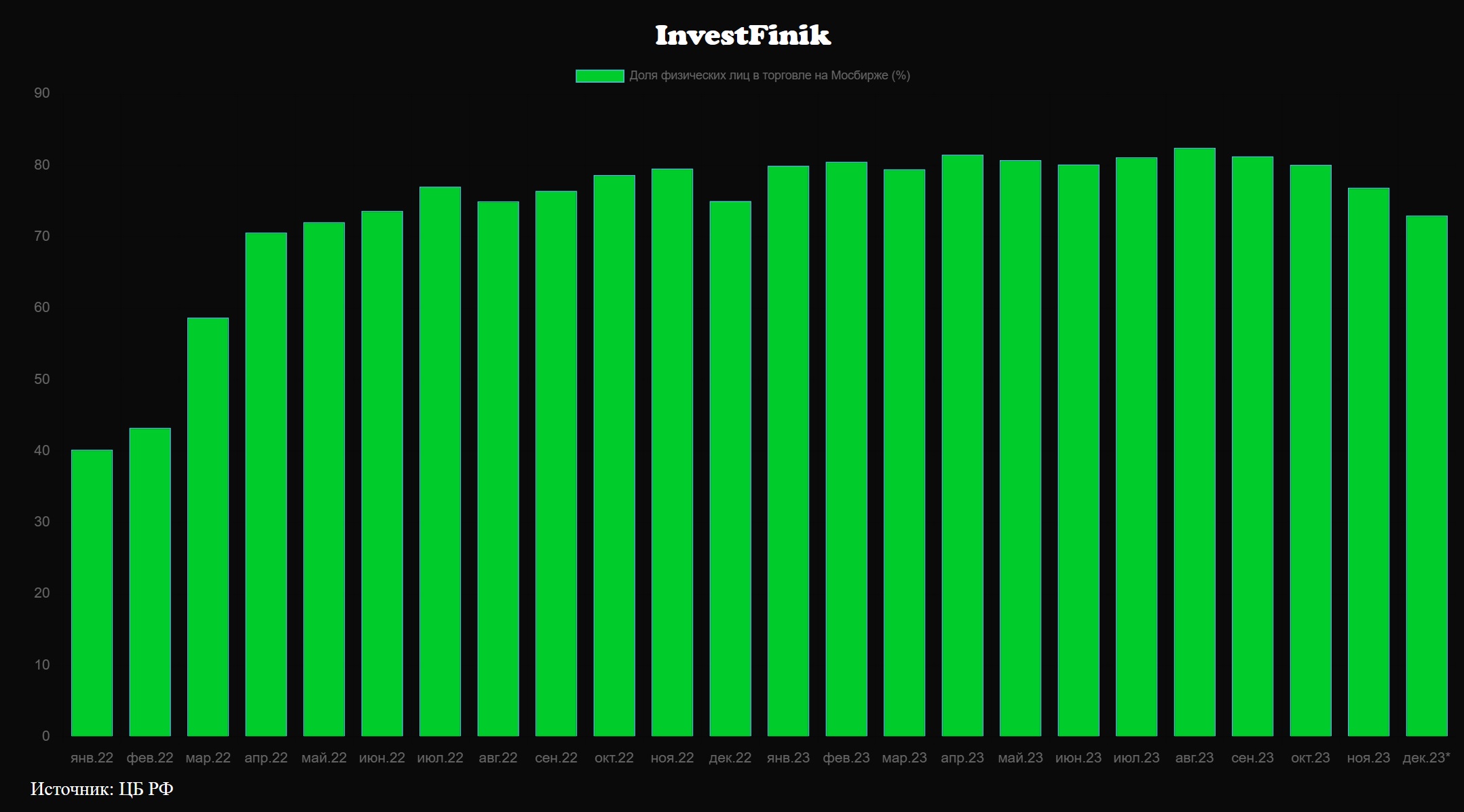 Физические лица продолжили оказывать огромное влияние на котировки ценных бумаг - по итогам года их объем в торгах составил в среднем 79%. Исходя из этих данных, можно предположить, что доля частных инвесторов продолжила снижаться и в декабре, упал примерно до 73%.