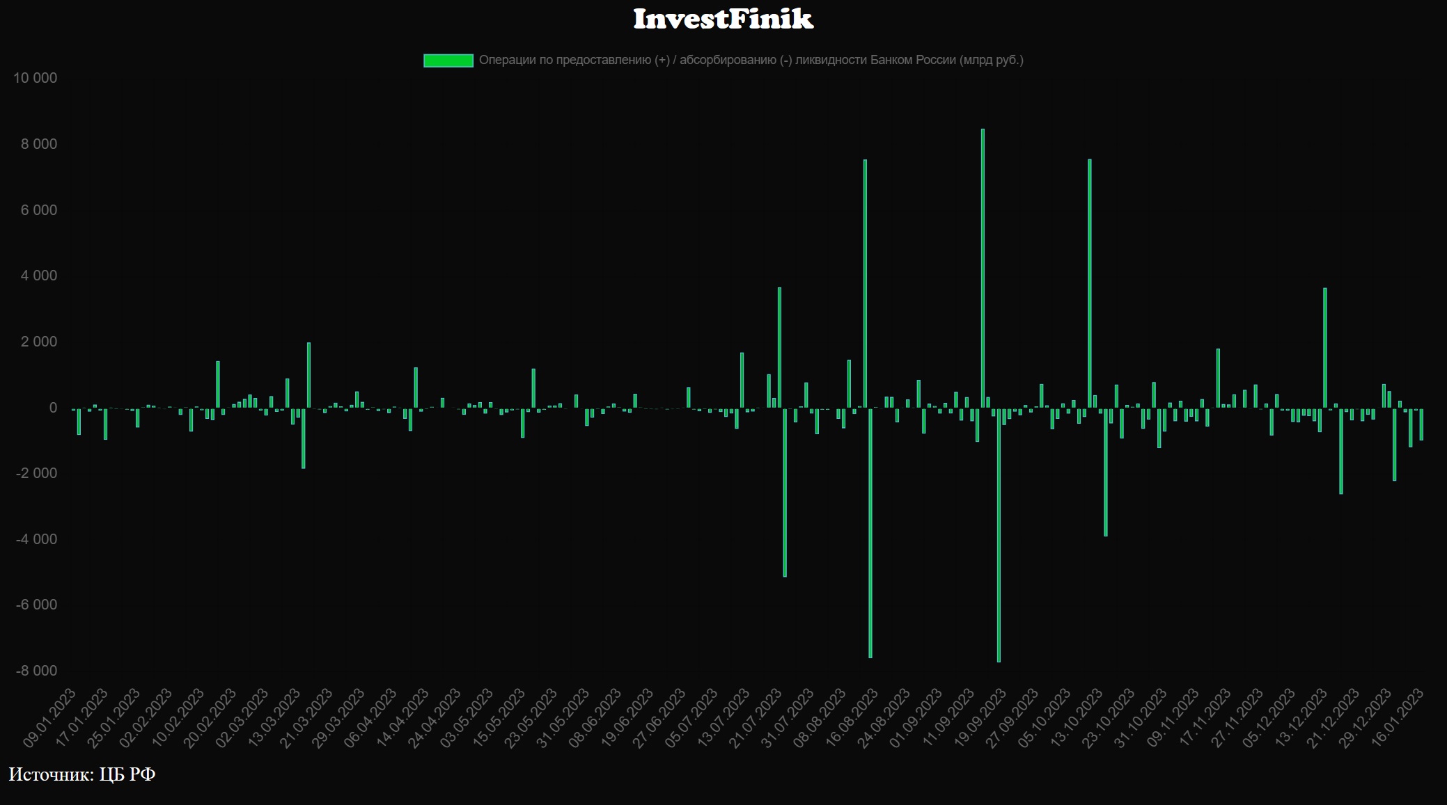 Банк России продолжает операции по изъятию ликвидности с рынка. По состоянию на 16 января в банковской системе РФ сформировался профицит рублевой ликвидности размером в 1,6 трлн рублей. На этом фоне ЦБ провел операции по изъятию рублей из системы на 984 млрд рублей.