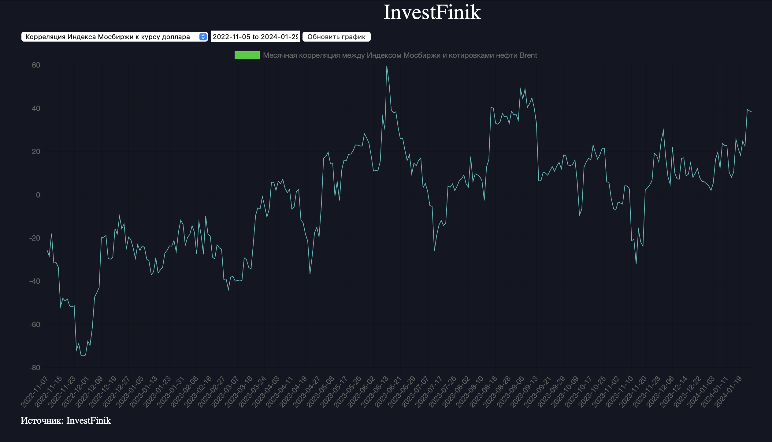 Если ранее корреляция между Индексом Мосбиржи и курсом доллара была либо отрицательная, либо вблизи нуля, то теперь зависимость выросла до 35-45%.