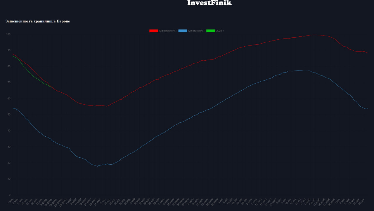 В Европе заполненность хранилищ () по состоянию на 10 февраля составляла 67%, что всего на 0,2 п.п. ниже, чем максимумы последних 5 лет. Спрос в Европе, тем самым, остается достаточно скромным.