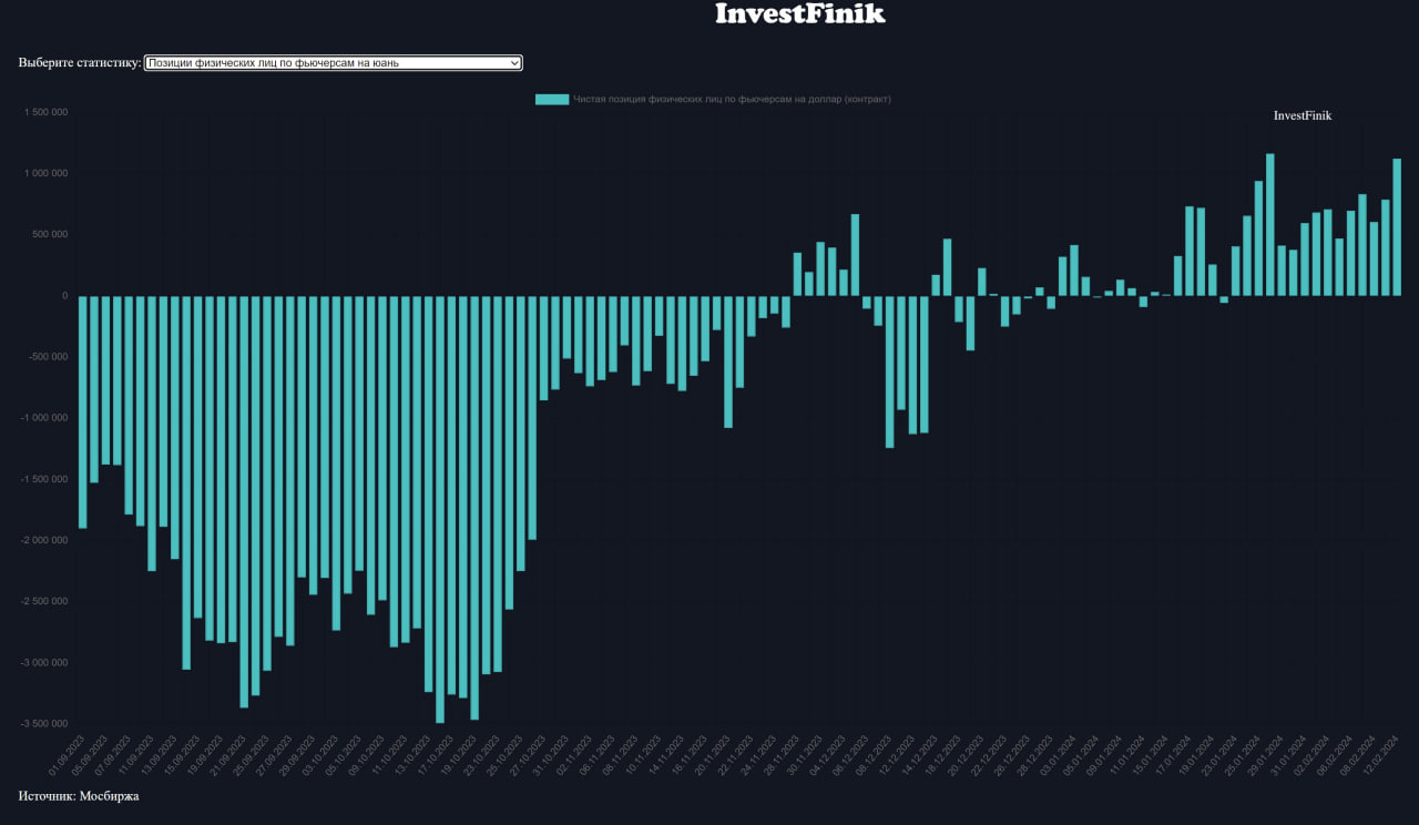 По итогам вчерашней основной сессии физические лица увеличили свои позиции во фьючерсах на юань и доллар. () Объем чистой длинной позиции по китайской валюте составил 1,1 млн контрактов - всего на 40 тыс. контрактов меньше рекорда последних 6 месяцев. По американской валюте чистый "лонг" был равен 132,8 тыс. контрактов.