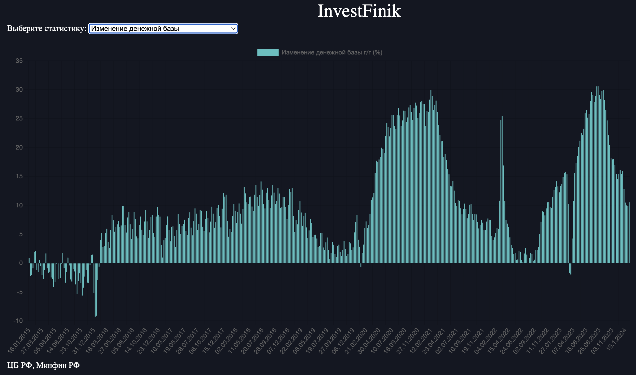 Денежная база России возобновила свой рост после полуторамесячного сокращения. Темпы прироста денежной базы по отношению к прошлому году вновь поднялись выше 10% на прошлой неделе, а самих наличных в системе стало больше.