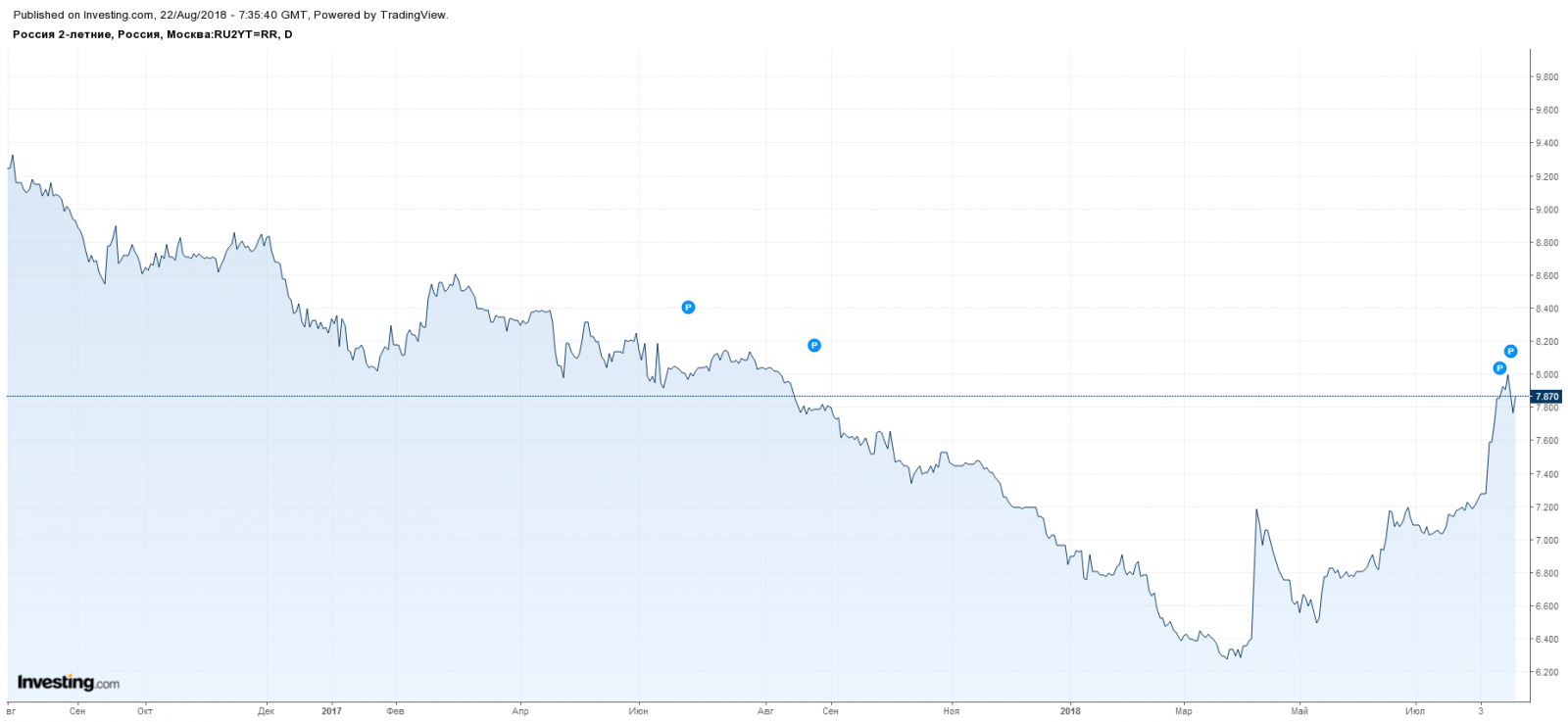 На рынке ОФЗ рыночная конъюнктура складывается следующим образом на утро 22 августа. Доходности по 10 летним ОФЗ находятся на уровне 8,63% годовых, доходность 2 летних бумаг 7,87% годовых.