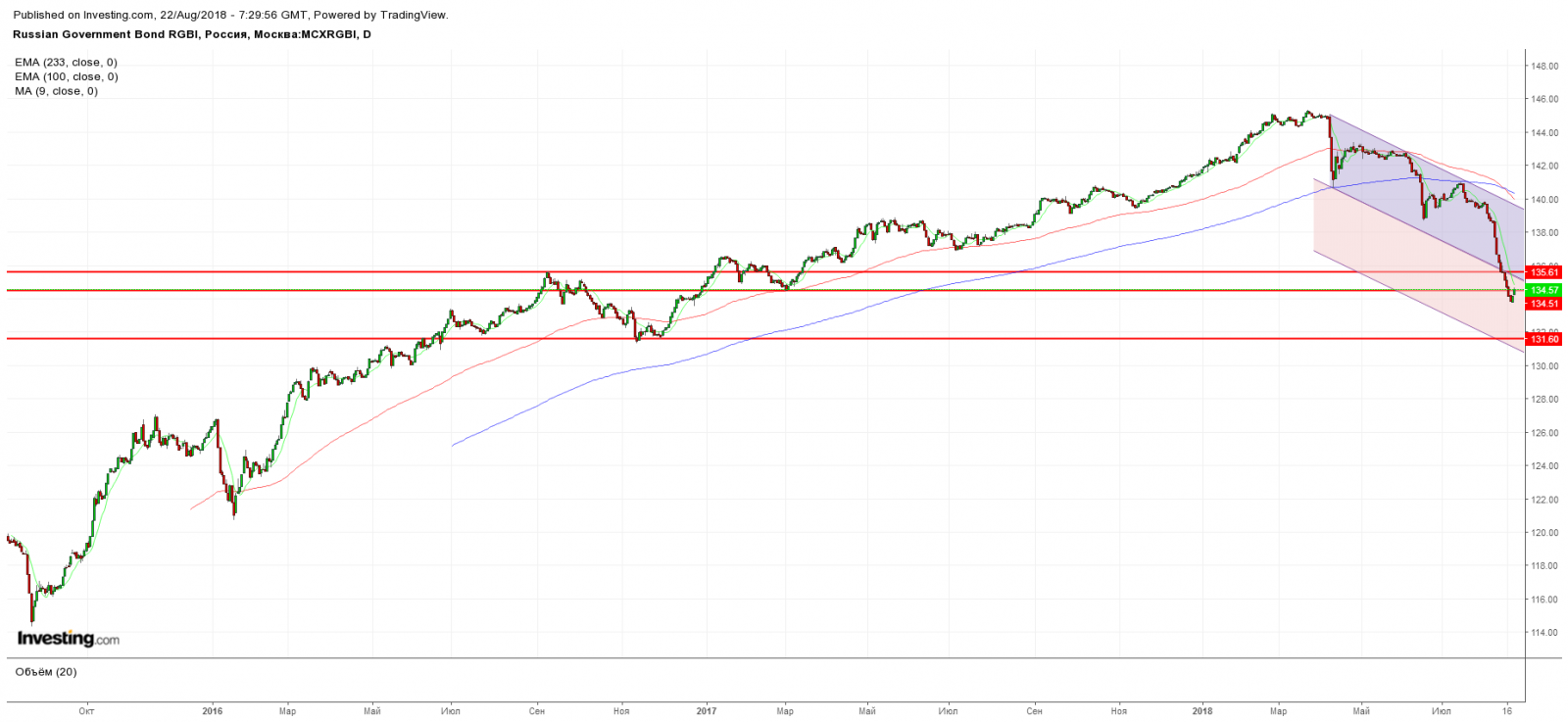 По 10 летним бумагам можем прийти в район 9,5%, 2 летки 8,6% годовых. А пока возможен временный отскок на что намекает график RGBI, на тест снизу пробитых уровней 134,51 (уже идет тест) и далее 135,61. Тренд остается медвежим.