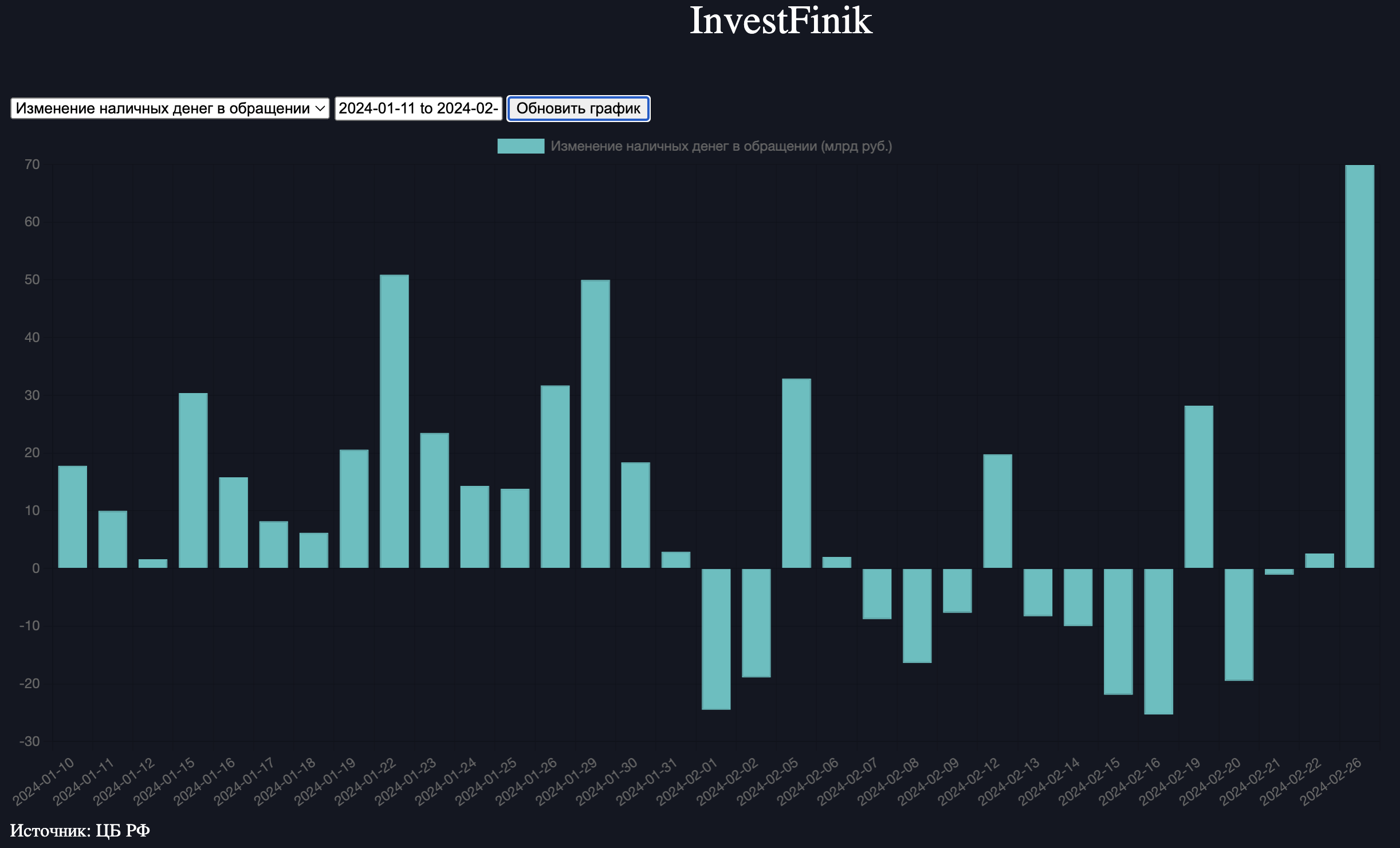 Весь февраль регулятор то изымал, то вновь печатал наличные денежные средства, однако вчера сумма вновь созданных купюр наконец-таки привела к росту наличных средств.