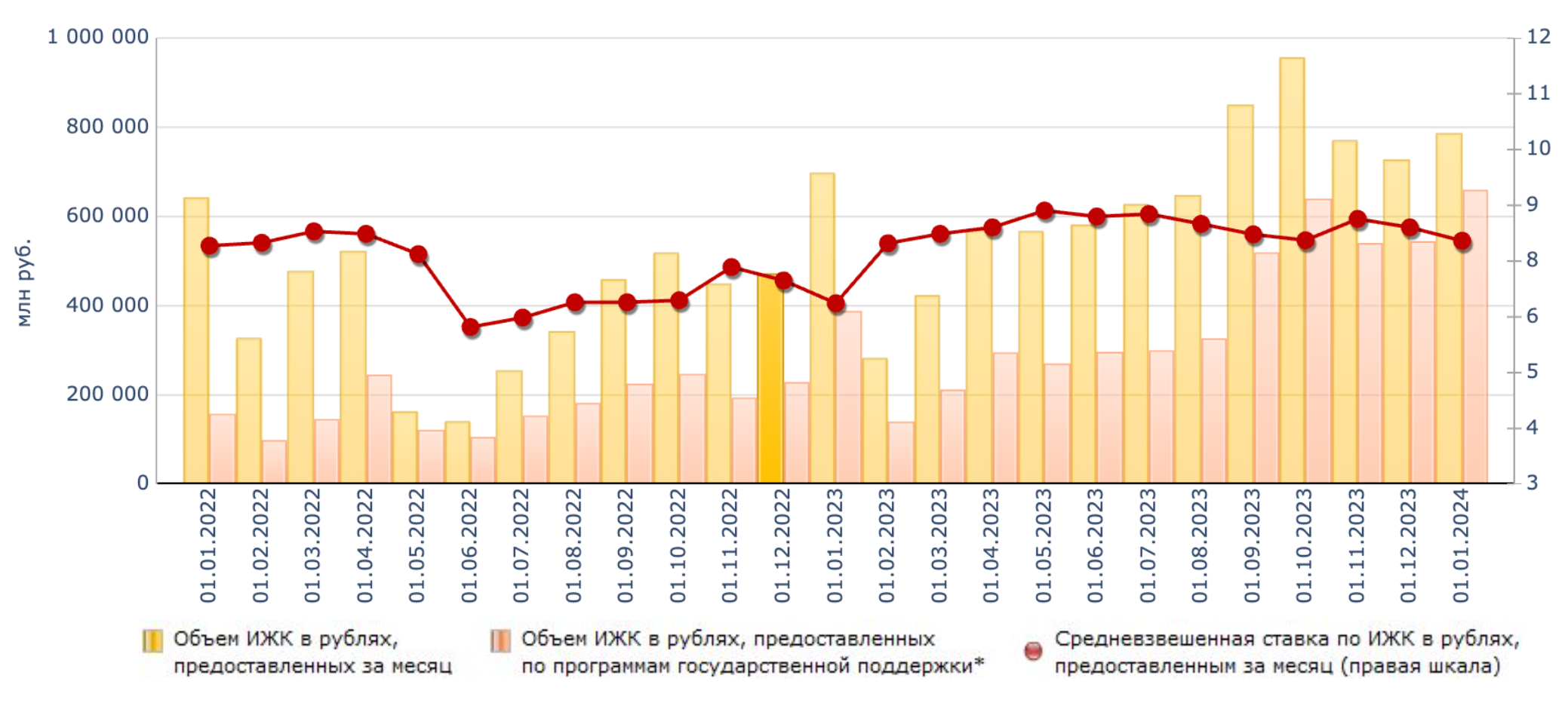 В 2023 году наблюдался бурный рост ипотечного кредитования. Объем выдачи ипотечных кредитов (индивидуальное жилищное кредитование, или ИЖК в определении ЦБ РФ) под покупку новостроек (ДДУ) вырос на 67% в количественном и на 64% - в денежном выражении. Общий объем выдачи ипотечных кредитов в России увеличился на 105% в количестве и на 56% - в деньгах.