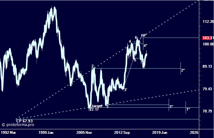 От хая 103.80 на недельном Плане даун МР ( модель расширения ) с уровнем НР 88,89 ~ на уровне т.2 месячной модели (уровни НР абы где не возникают), в случае пробое «движение» на 100% уровня НР: