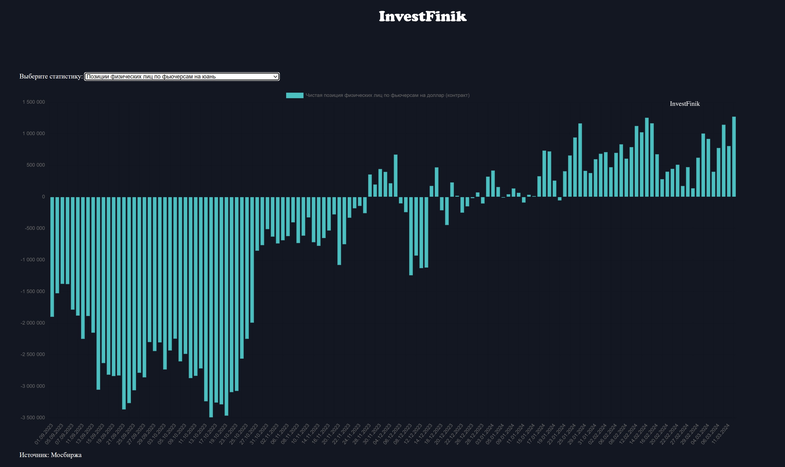 По итогам вчерашней основной сессии частные спекулянты имели рекордную за последние несколько лет чистую длинную позицию по фьючерсам на юань против рубля. Общий объем был равен 1,27 млн контрактов. Предыдущий рекорд от 14 февраля переписан на 17 тыс. контрактов.