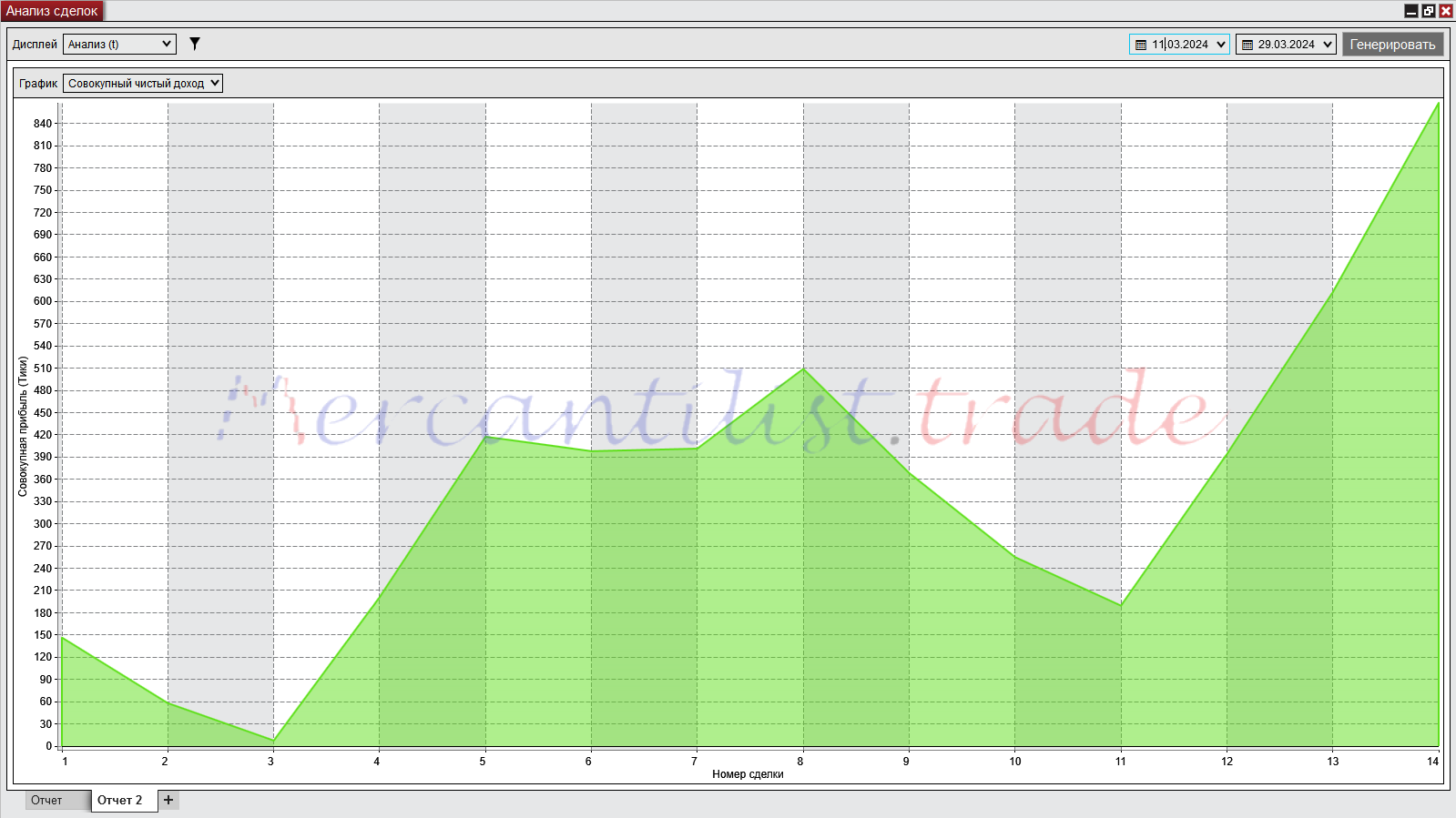 Общая прибыль реализована в тиках + 868 тиков.